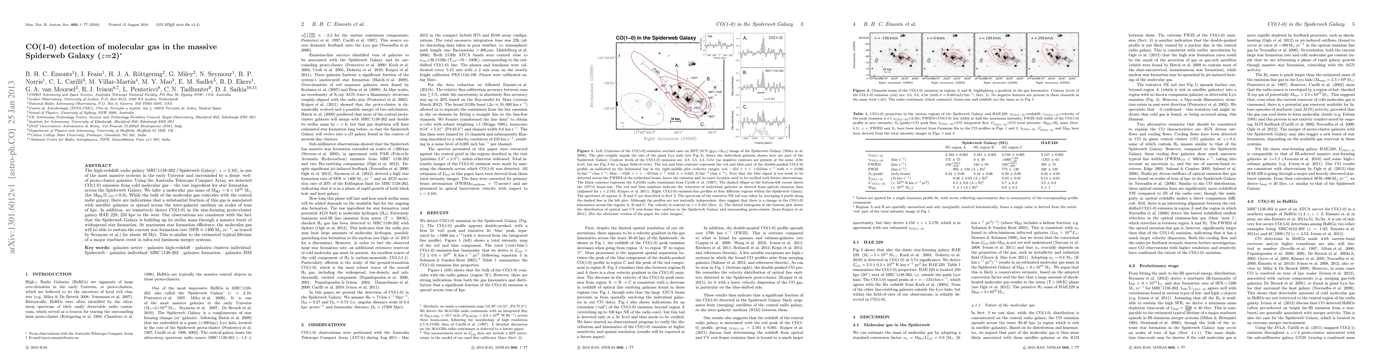 The Australia Telescope Compact Array detected CO(1-0) emission from cold molecular gas in the massive Spiderweb Galaxy (z=2.16), indicating a molecular gas mass of 6x10^10 M(sun). The gas is primarily associated with the central radio galaxy but also appears in satellite galaxies and the intergalactic medium.