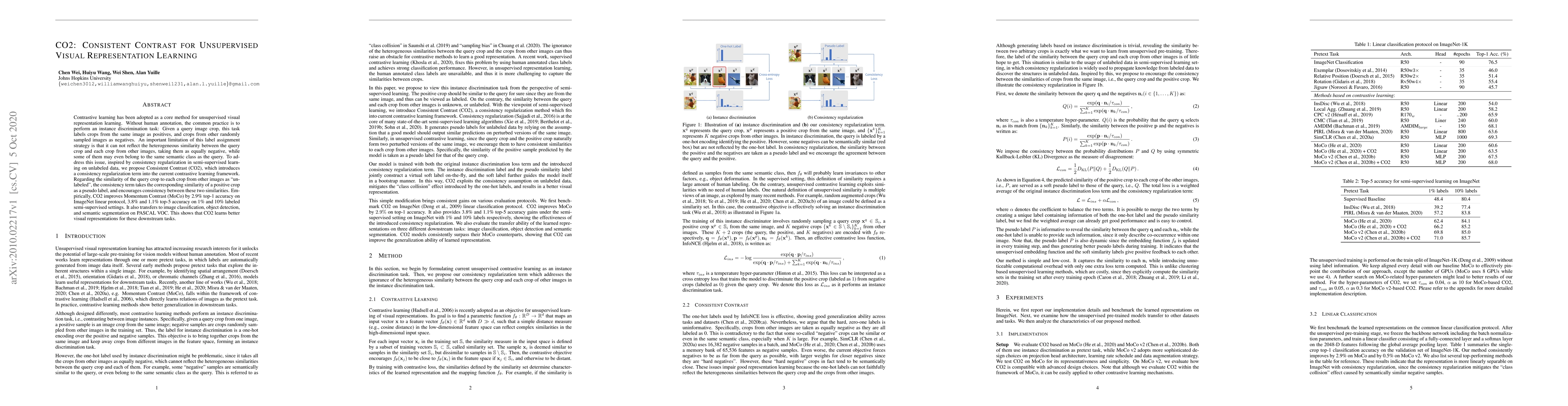 The paper proposes Consistent Contrast (CO2), a method that enhances unsupervised visual representation learning by incorporating consistency regularization. CO2 improves upon existing contrastive learning techniques by addressing the limitation of treating all negative samples uniformly, leading to better performance in image classification, object detection, and semantic segmentation.