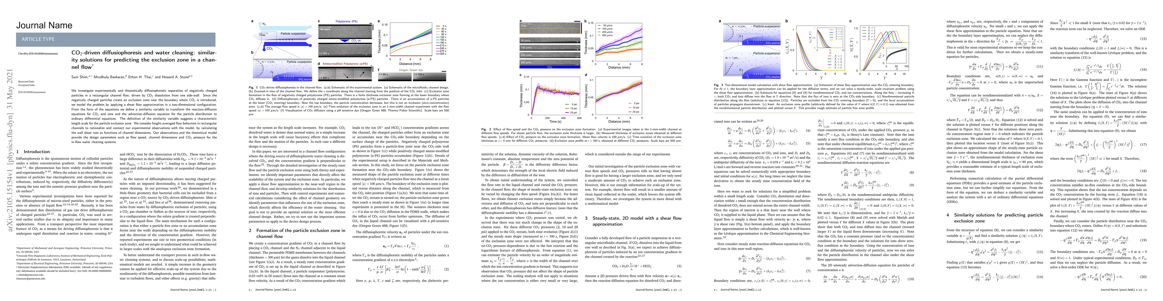 This paper explores the diffusiophoretic separation of negatively charged particles in a channel flow driven by CO2 dissolution, using both experimental and theoretical approaches. The study defines a similarity variable to simplify the governing equations and determine a characteristic length scale for the particle exclusion zone, providing design parameters for water cleaning systems.