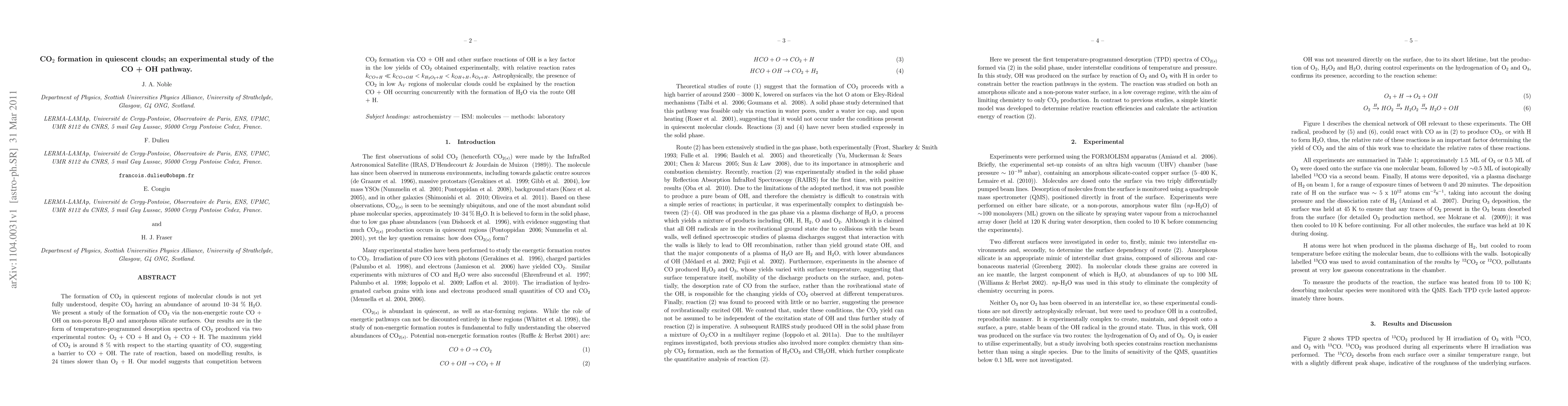 This study investigates CO2 formation via the CO + OH pathway in quiescent molecular clouds, finding that CO2 yields are low due to competition with other surface reactions. The maximum CO2 yield is about 8% from CO, indicating a significant barrier for the CO + OH reaction.