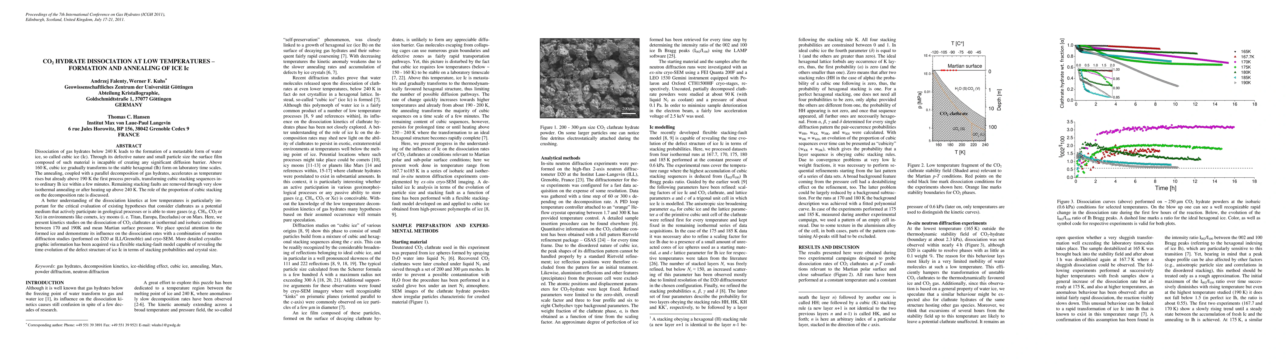 Dissociation of gas hydrates below 240 K leads to the formation of a metastable form of water ice, so called cubic ice (Ic). Through its defective nature and small particle size the surface film composed of such material is incapable of creating any significant diffusion barrier. Above 160 K, cubic ice gradually transforms to the stable hexagonal (Ih) form on laboratory time scales. The annealing, coupled with a parallel decomposition of gas hydrates, accelerates as temperature rises but already above 190 K the first process prevails, transforming cubic stacking sequences in-to ordinary Ih ice within a few minutes. Remaining stacking faults are removed through very slow isothermal annealing or after heating up above 240 K. The role of the proportion of cubic stacking on the decomposition rate is discussed. A better understanding of the dissociation kinetics at low temperatures is particularly im-portant for the critical evaluation of existing hypotheses that consider clathrates as a potential medium that actively participate in geological processes or is able to store gases (e.g. CH4, CO2 or Xe) in environments like comets, icy moons (i. e. Titan, Europa, Enceladus) or on Mars. Here, we present kinetics studies on the dissociation of CO2 clathrates at isothermal and isobaric conditions between 170 and 190K and mean Martian surface pressure. We place special attention to the formed ice and demonstrate its influence on the dissociation rates with a combination of neutron diffraction studies (performed on D20 at ILL/Grenoble) and cryo-SEM. More detailed crystallo-graphic information has been acquired via a flexible stacking-fault model capable of revealing the time evolution of the defect structure of ice Ic in terms of stacking probabilities and crystal size.