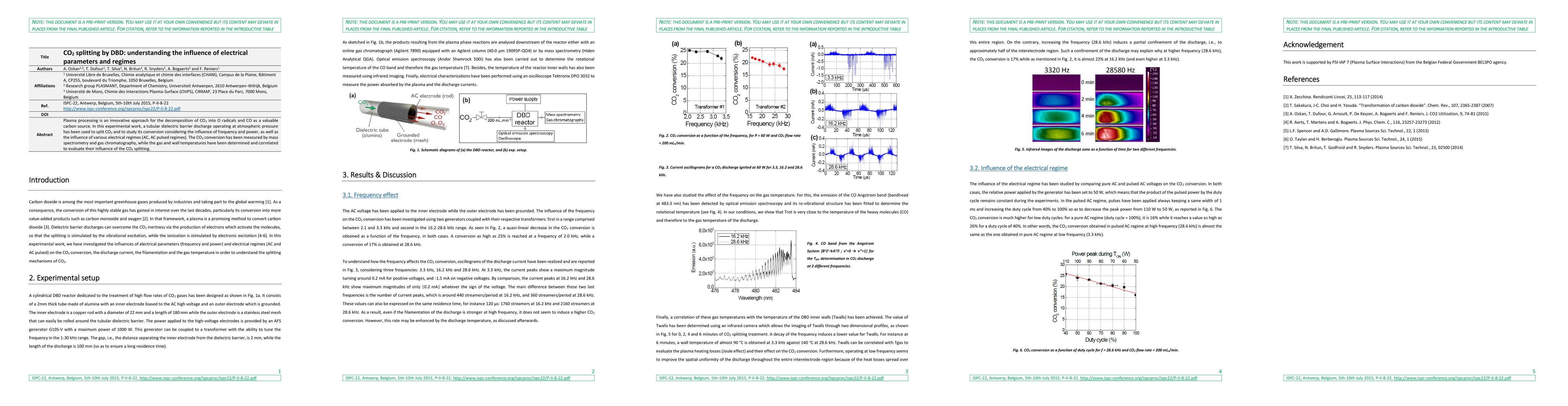 Researchers used a tubular dielectric barrier discharge to split CO2 into valuable carbon sources like O radicals and CO, studying its conversion with varying electrical parameters and regimes. The study aimed to understand the influence of frequency, power, and AC pulsed regimes on CO2 splitting.