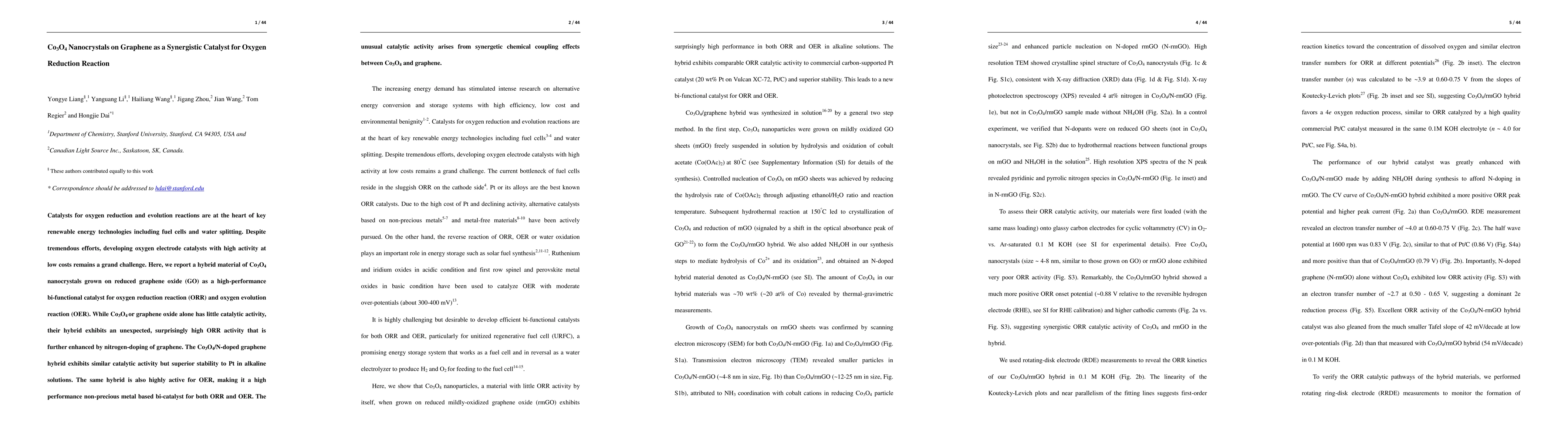 This paper reports on Co3O4 nanocrystals grown on reduced graphene oxide as a synergistic catalyst for both oxygen reduction and evolution reactions, exhibiting unexpectedly high activity and stability, particularly when nitrogen-doped, due to synergistic interactions between Co3O4 and graphene.