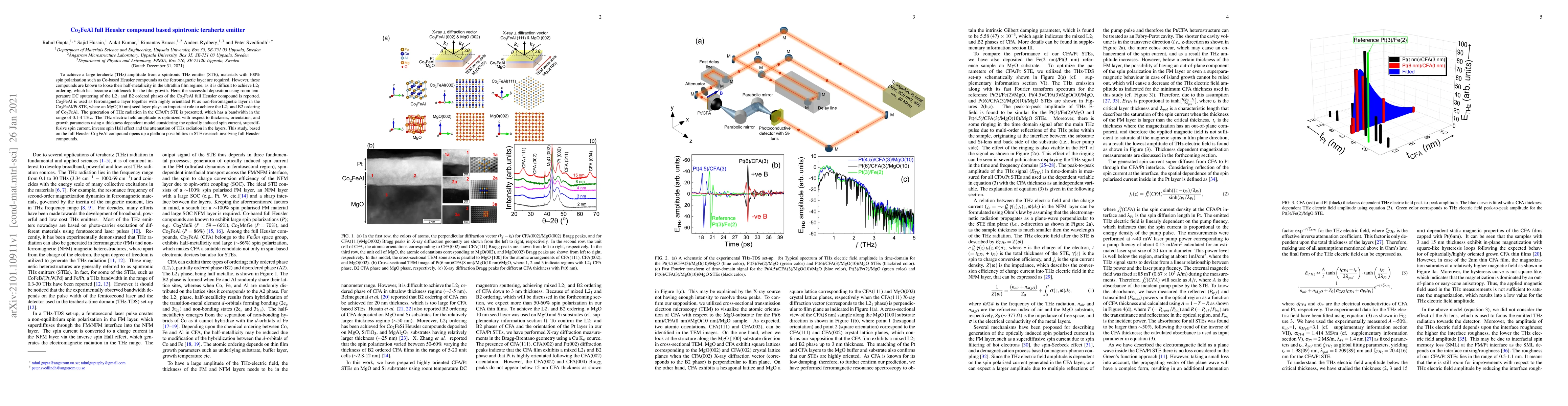 To achieve a large terahertz (THz) amplitude from a spintronic THz emitter (STE), materials with 100\% spin polarisation such as Co-based Heusler compounds as the ferromagnetic layer are required. However, these compounds are known to loose their half-metallicity in the ultrathin film regime, as it is difficult to achieve L2$_1$ ordering, which has become a bottleneck for the film growth. Here, the successful deposition using room temperature DC sputtering of the L2$_1$ and B2 ordered phases of the Co$_2$FeAl full Heusler compound is reported. Co$_2$FeAl is used as ferromagnetic layer together with highly orientated Pt as non-ferromagnetic layer in the Co$_2$FeAl/Pt STE, where an MgO(10 nm) seed layer plays an important role to achieve the L2$_1$ and B2 ordering of Co$_2$FeAl. The generation of THz radiation in the CFA/Pt STE is presented, which has a bandwidth in the range of 0.1-4 THz. The THz electric field amplitude is optimized with respect to thickness, orientation, and growth parameters using a thickness dependent model considering the optically induced spin current, superdiffusive spin current, inverse spin Hall effect and the attenuation of THz radiation in the layers. This study, based on the full Heusler Co$_2$FeAl compound opens up a plethora possibilities in STE research involving full Heusler compounds.