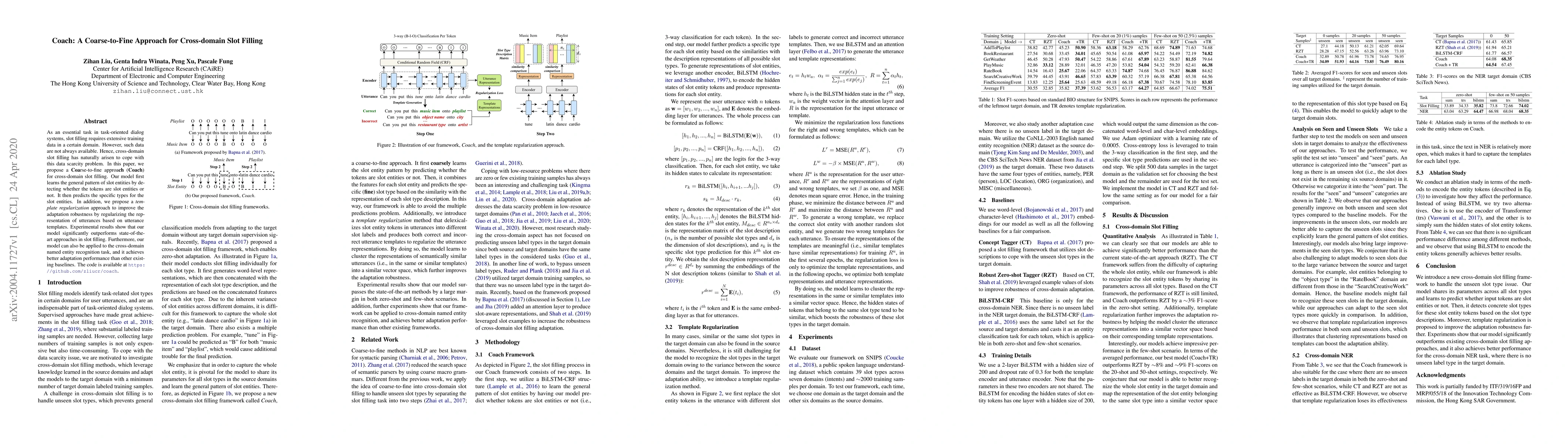 This paper introduces Coach, a Coarse-to-fine approach for cross-domain slot filling, which first identifies slot entities and then predicts their specific types, enhanced by template regularization for improved adaptation. The model outperforms existing methods and also shows better performance in cross-domain named entity recognition.