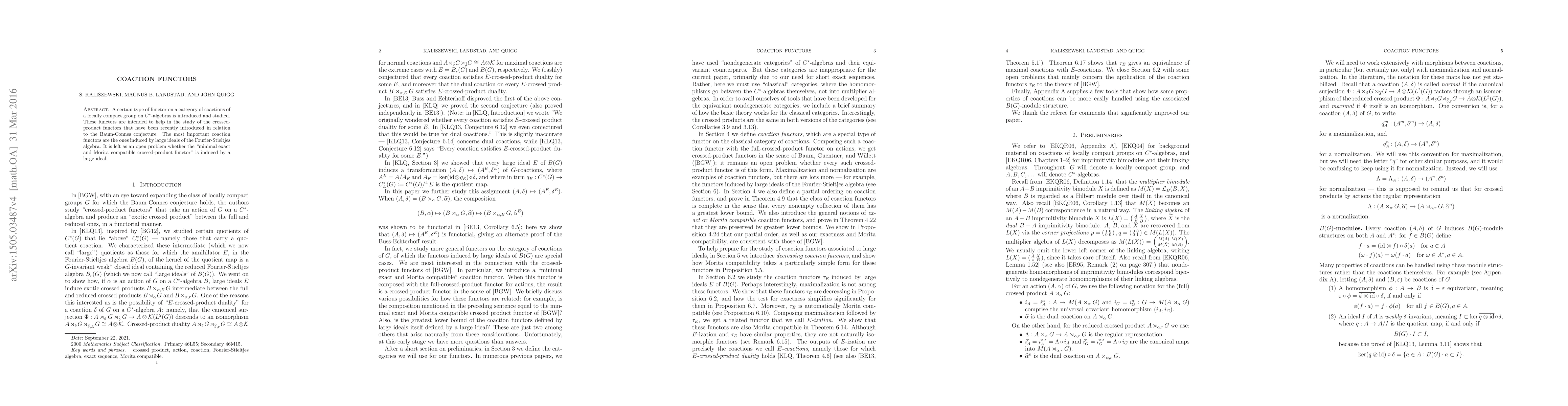 Summary: This paper introduces and studies coaction functors on categories of coactions by locally compact groups on C*-algebras, aiming to aid in the investigation of crossed-product functors relevant to the Baum-Connes conjecture. It highlights the significance of functors induced by large ideals in the Fourier-Stieltjes algebra, leaving open the question of whether the minimal exact and Morita compatible crossed-product functor is such an inducer.