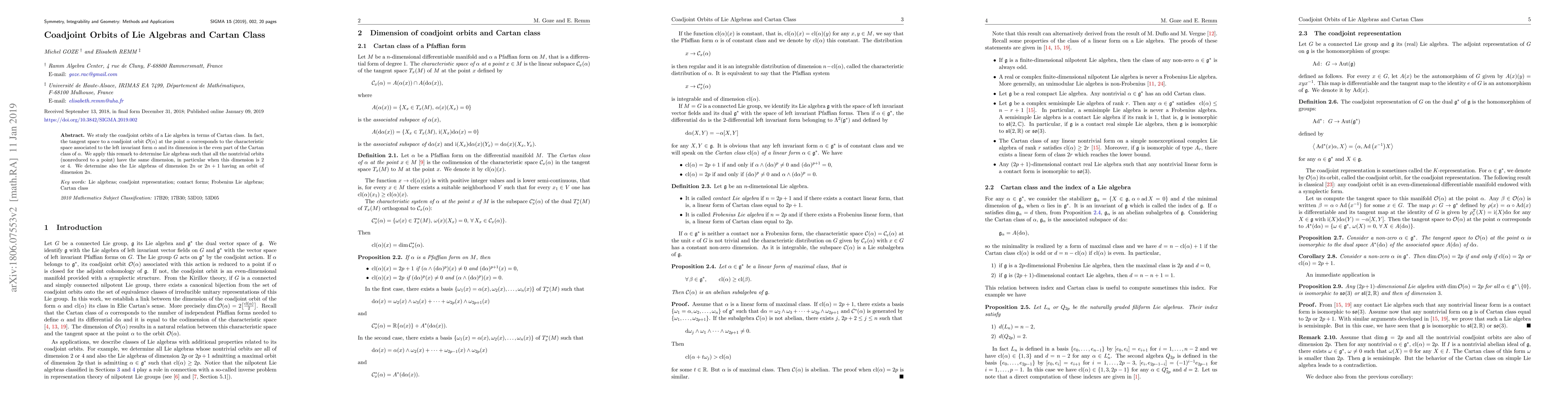 This paper investigates the relationship between coadjoint orbits of Lie algebras and the Cartan class, showing that the dimension of the tangent space at a coadjoint orbit corresponds to the even part of the Cartan class. The study identifies Lie algebras where all nontrivial orbits have the same dimension, particularly those with dimensions 2 or 4.