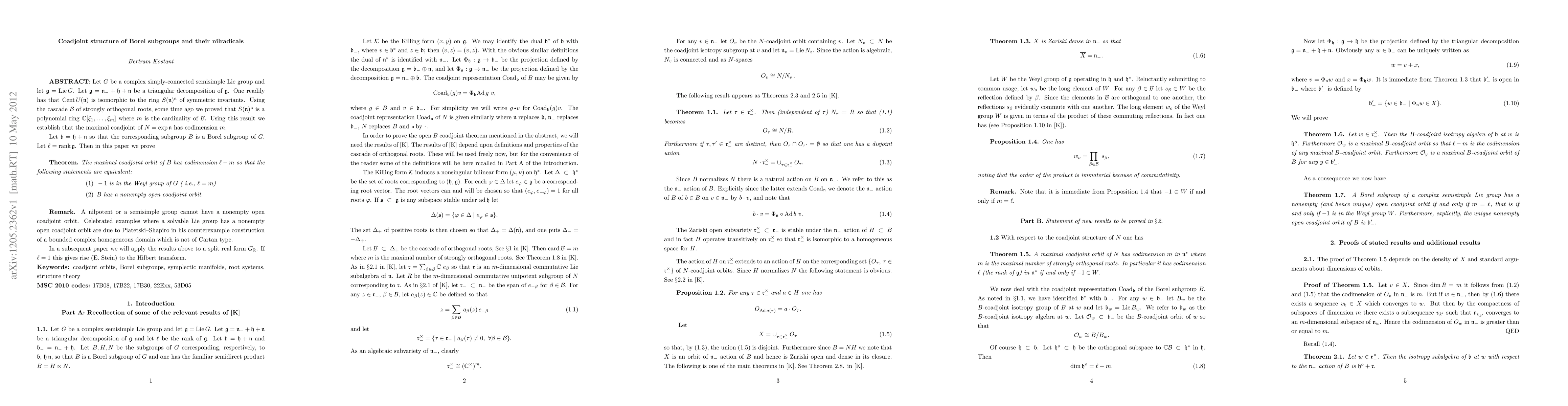 Let $G$ be a complex simply-connected semisimple Lie group and let $\frak{g}= Lie G$. Let $\frak{g} = \frak{n}_- +\frak{h} + \frak{n}$ be a triangular decomposition of $\frak{g}$. One readily has that $Cent\,U({\frak n})$ is isomorphic to the ring $S({\frak n})^{{\frak\n}}$ of symmetric invariants. Using the cascade ${\cal B}$ of strongly orthogonal roots, some time ago we proved that $S({\frak n})^{{\frak n}$ is a polynomial ring $\Bbb C [\xi_1,...,\xi_m]$ where $m$ is the cardinality of ${\cal B}$. Using this result we establish that the maximal coadjoint of $N = exp \frak {n}$ has codimension $m$. Let $\frak {b}= \frak {h} + \frak {n}$ so that the corresponding subgroup $B$ is a Borel subgroup of $G$. Let $\ell = rank \frak{g}$. Then in this paper we prove the theorem that the maximal coadjoint orbit of $B$ has codimension $\ell - m$ so that the following statements (1) and (2) are equivalent: (1) -1 is in the Weyl group of $G$ (i.e., $\ell = m$), and (2), B has a nonempty open coadjoint orbit. We remark that a nilpotent or a semisimple group cannot have a nonempty open coadjoint orbit. Celebrated examples where a solvable Lie group has a nonempty open coadjoint orbit are due to Piatetski--Shapiro in his counterexample construction of a bounded complex homogeneous domain which is not of Cartan type.