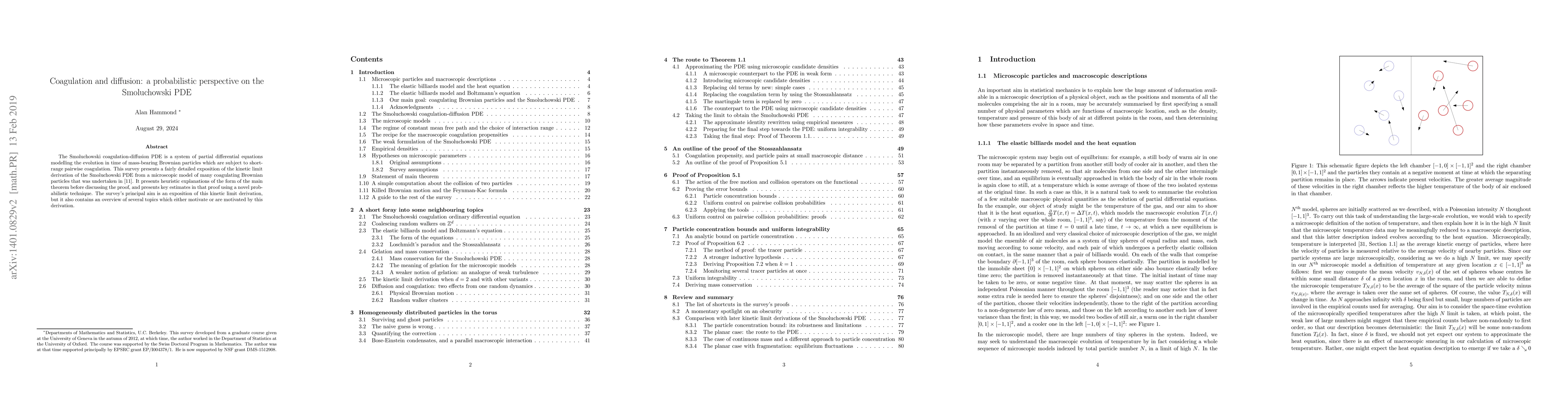 The Smoluchowski coagulation-diffusion PDE is a system of partial differential equations modelling the evolution in time of mass-bearing Brownian particles which are subject to short-range pairwise coagulation. This survey presents a fairly detailed exposition of the kinetic limit derivation of the Smoluchowski PDE from a microscopic model of many coagulating Brownian particles that was undertaken in [11]. It presents heuristic explanations of the form of the main theorem before discussing the proof, and presents key estimates in that proof using a novel probabilistic technique. The survey's principal aim is an exposition of this kinetic limit derivation, but it also contains an overview of several topics which either motivate or are motivated by this derivation.
