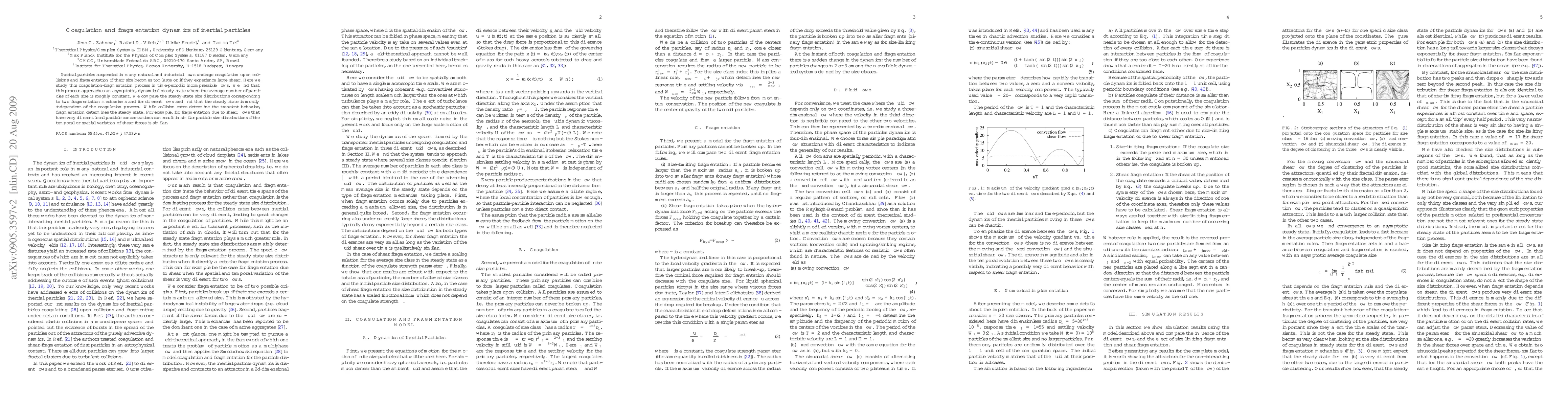 Inertial particles suspended in many natural and industrial flows undergo coagulation upon collisions and fragmentation if their size becomes too large or if they experience large shear. Here we study this coagulation-fragmentation process in time-periodic incompressible flows. We find that this process approaches an asymptotic, dynamical steady state where the average number of particles of each size is roughly constant. We compare the steady-state size distributions corresponding to two fragmentation mechanisms and for different flows and find that the steady state is mostly independent of the coagulation process. While collision rates determine the transient behavior, fragmentation determines the steady state. For example, for fragmentation due to shear, flows that have very different local particle concentrations can result in similar particle size distributions if the temporal or spatial variation of shear forces is similar.