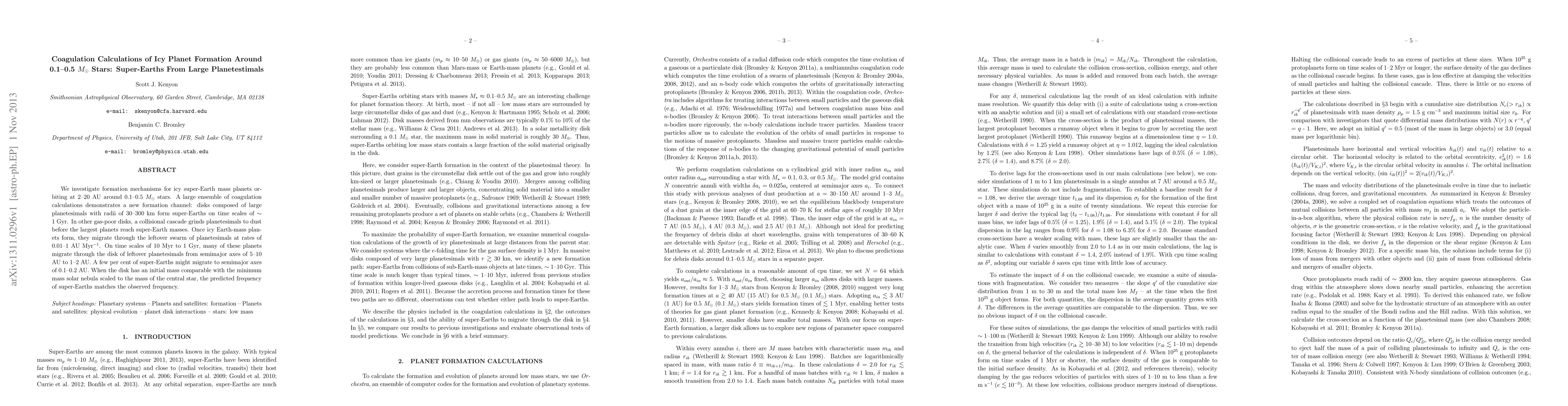 This paper explores the formation of icy super-Earths around low-mass stars using coagulation calculations, revealing a new formation pathway via large planetesimals. These planets migrate inward through leftover planetesimals, potentially explaining the observed frequency of super-Earths.