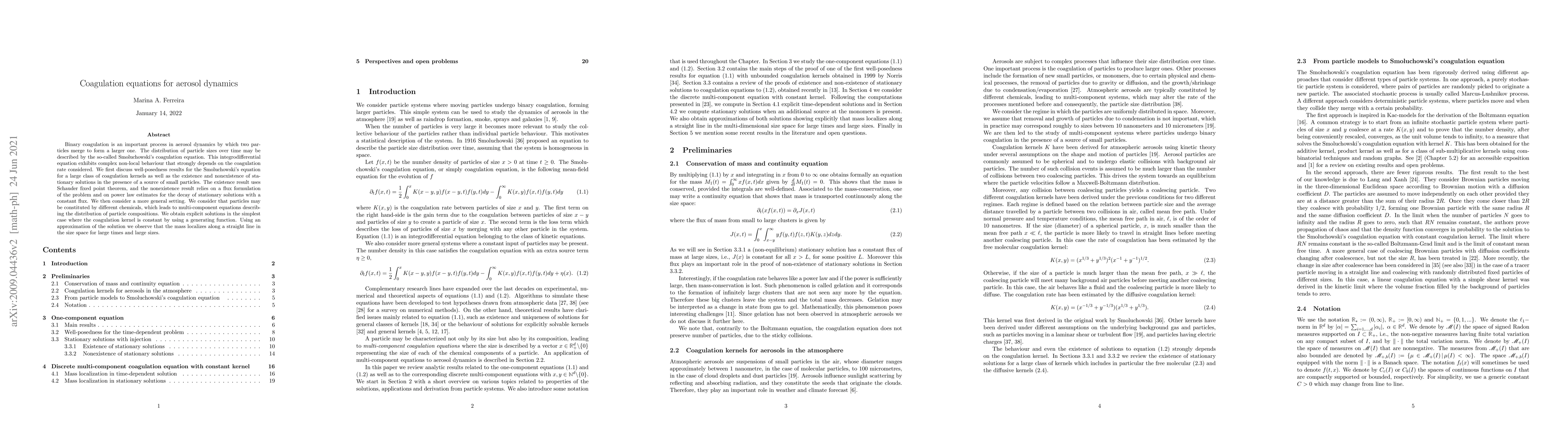 Binary coagulation is an important process in aerosol dynamics by which two particles merge to form a larger one. The distribution of particle sizes over time may be described by the so-called Smoluchowski's coagulation equation. This integrodifferential equation exhibits complex non-local behaviour that strongly depends on the coagulation rate considered. We first discuss well-posedness results for the Smoluchowski's equation for a large class of coagulation kernels as well as the existence and nonexistence of stationary solutions in the presence of a source of small particles. The existence result uses Schauder fixed point theorem, and the nonexistence result relies on a flux formulation of the problem and on power law estimates for the decay of stationary solutions with a constant flux. We then consider a more general setting. We consider that particles may be constituted by different chemicals, which leads to multi-component equations describing the distribution of particle compositions. We obtain explicit solutions in the simplest case where the coagulation kernel is constant by using a generating function. Using an approximation of the solution we observe that the mass localizes along a straight line in the size space for large times and large sizes.