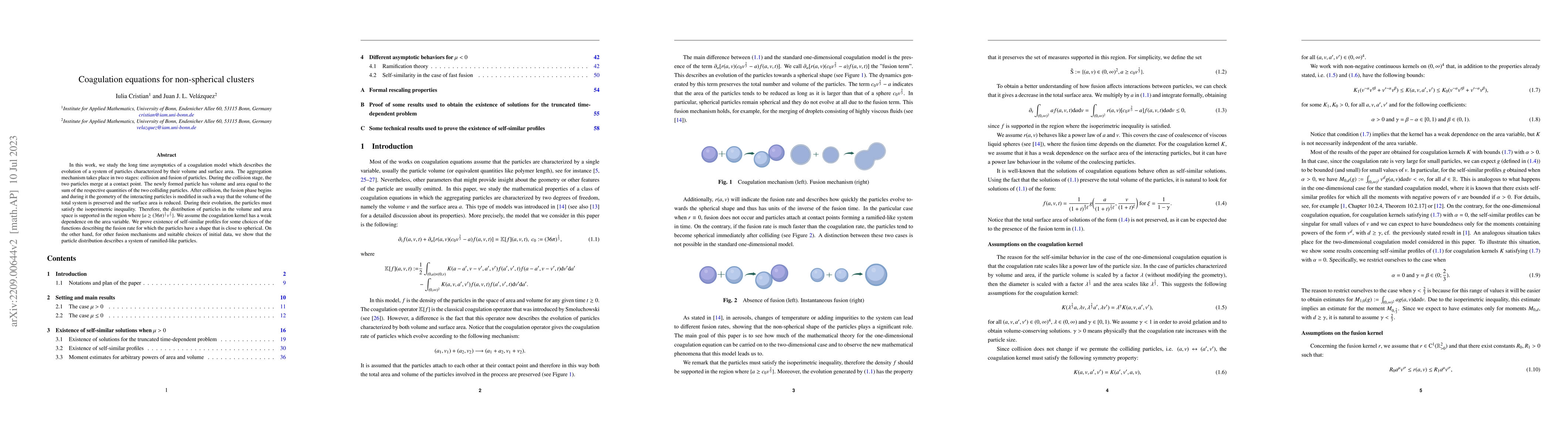 This paper investigates the long-term behavior of a coagulation model for non-spherical clusters, focusing on the evolution of particle volume and surface area through collision and fusion stages. It proves the existence of self-similar profiles for spherical-like shapes and describes ramified particle distributions under different fusion mechanisms.