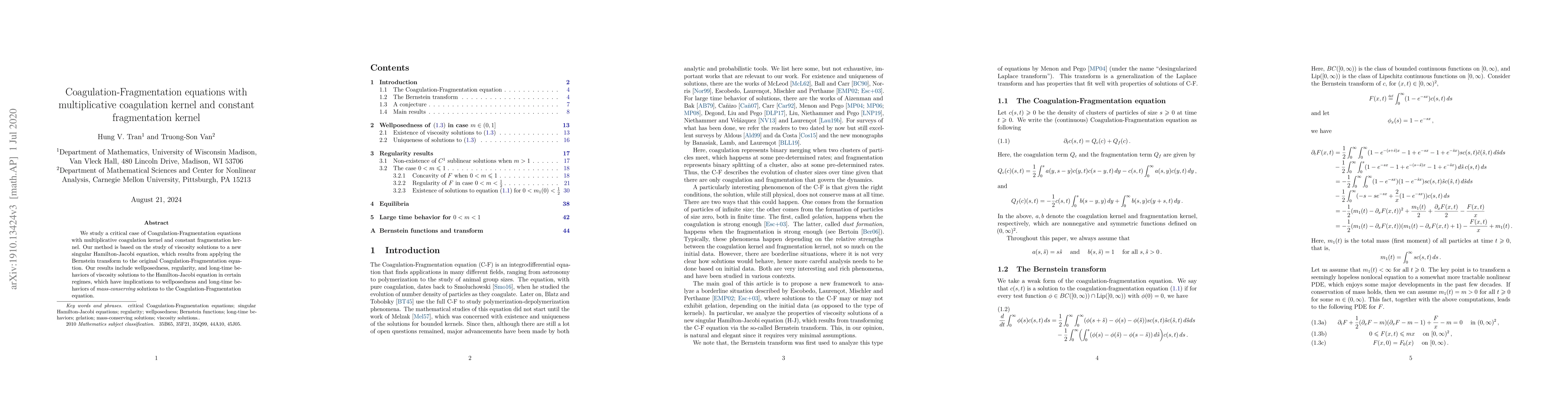 We study a critical case of Coagulation-Fragmentation equations with multiplicative coagulation kernel and constant fragmentation kernel. Our method is based on the study of viscosity solutions to a new singular Hamilton-Jacobi equation, which results from applying the Bernstein transform to the original Coagulation-Fragmentation equation. Our results include wellposedness, regularity and long-time behaviors of viscosity solutions to the Hamilton-Jacobi equation in certain regimes, which have implications to wellposedness and long-time behaviors of \emph{mass-conserving} solutions to the Coagulation-Fragmentation equation.