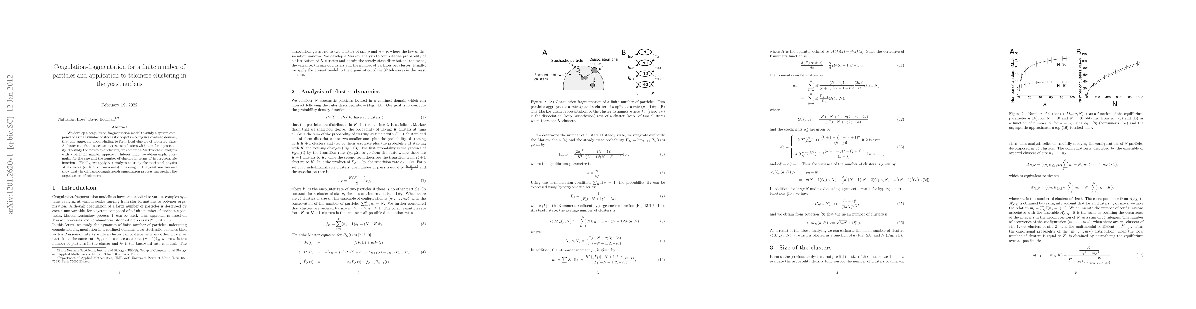 This paper develops a coagulation-fragmentation model to analyze systems with a small number of stochastic objects that can cluster and break apart. The authors apply their model to study telomere clustering in the yeast nucleus, revealing that the diffusion-coagulation-fragmentation process can predict telomere organization.