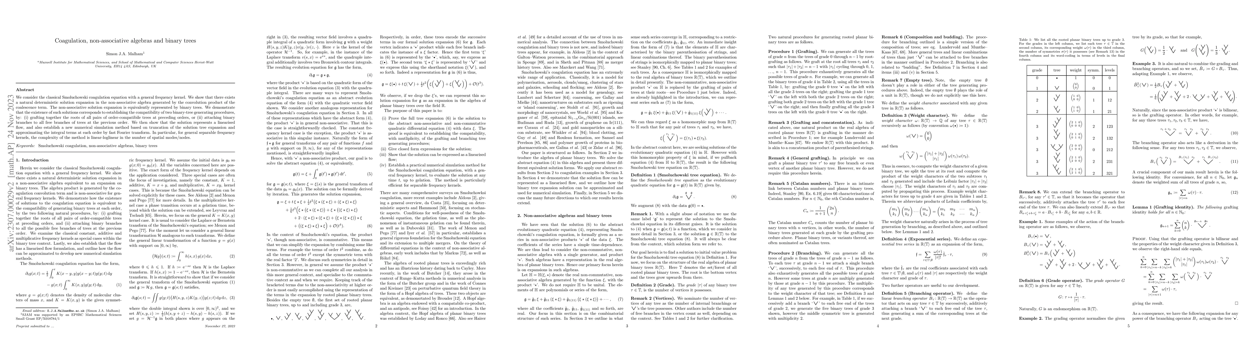We consider the classical Smoluchowski coagulation equation with a general frequency kernel. We show that there exists a natural deterministic solution expansion in the non-associative algebra generated by the convolution product of the coalescence term. The non-associative solution expansion is equivalently represented by binary trees. We demonstrate that the existence of such solutions corresponds to establishing the compatibility of two binary-tree generating procedures, by: (i) grafting together the roots of all pairs of order-compatibile trees at preceding orders, or (ii) attaching binary branches to all free branches of trees at the previous order. We then show that the solution represents a linearised flow, and also establish a new numerical simulation method based on truncation of the solution tree expansion and approximating the integral terms at each order by fast Fourier transform. In particular, for general separable frequency kernels, the complexity of the method is linear-loglinear in the number of spatial modes/nodes.
