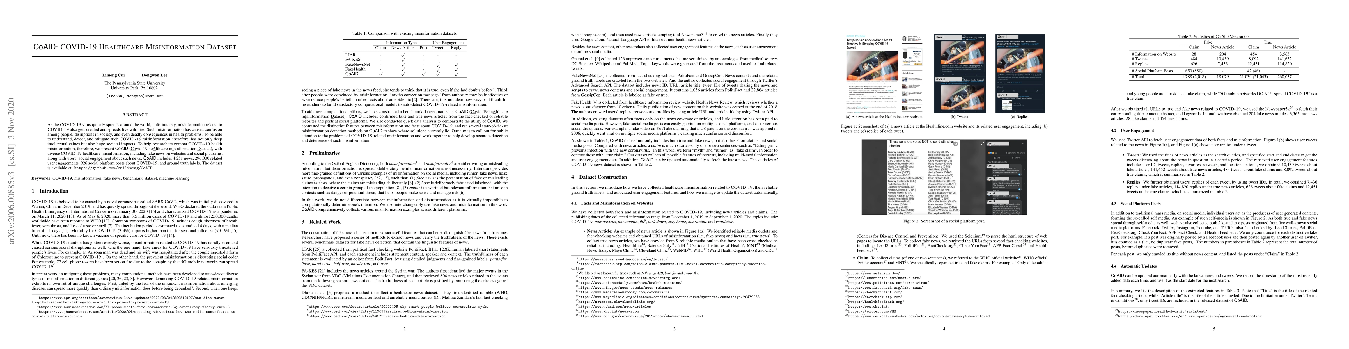 CoAID is a comprehensive dataset introduced to combat COVID-19 healthcare misinformation, containing 4,251 pieces of misinformation, 296,000 user engagements, and 926 social platform posts, along with ground truth labels to facilitate research in detection and mitigation. Available at https://github.com/cuilimeng/CoAID.