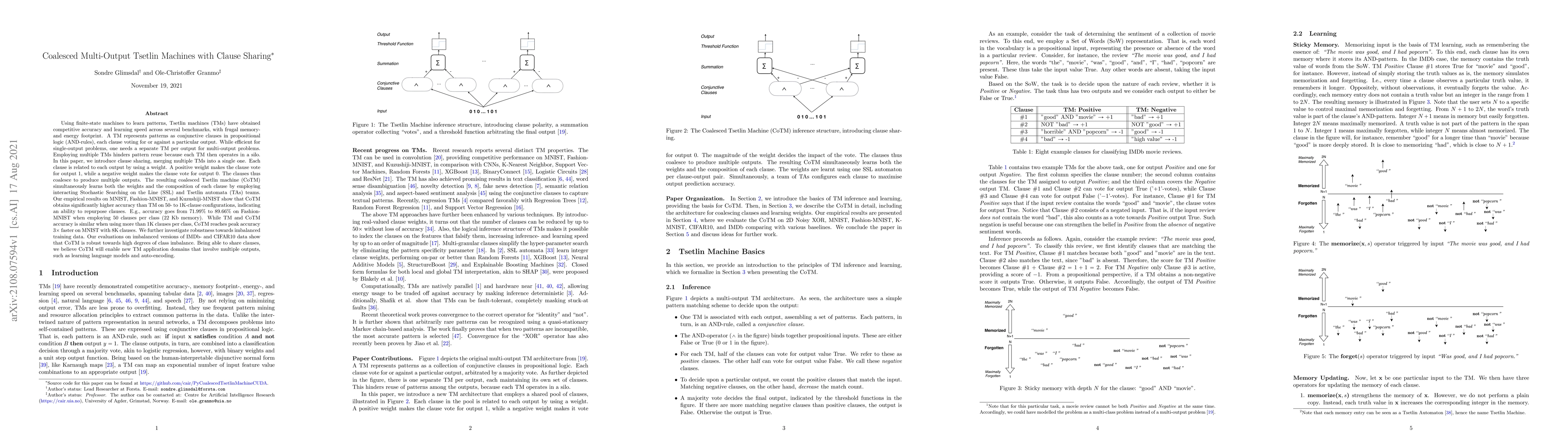 This paper introduces coalesced multi-output Tsetlin Machines (CoTM) that share clauses among multiple outputs, improving efficiency and accuracy compared to separate Tsetlin Machines (TMs). CoTM achieves higher accuracy and faster learning on datasets like MNIST and Fashion-MNIST, demonstrating robustness to class imbalance and potential for new applications involving multiple outputs.