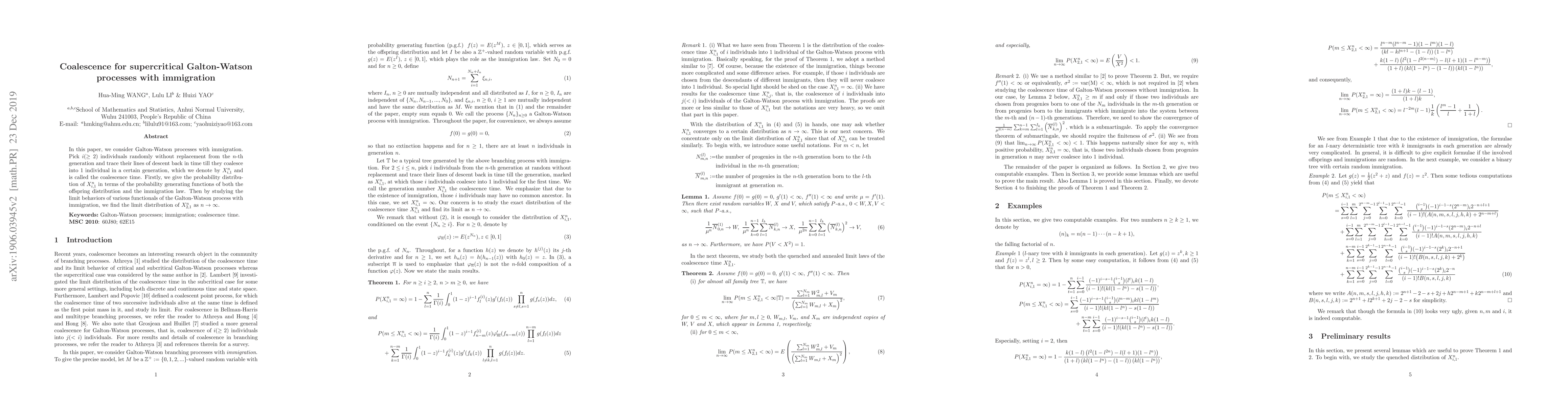 This paper investigates Galton-Watson processes with immigration, focusing on the coalescence time of randomly selected individuals. It provides the probability distribution for the coalescence time and determines the limit distribution of this time as the generation size approaches infinity.