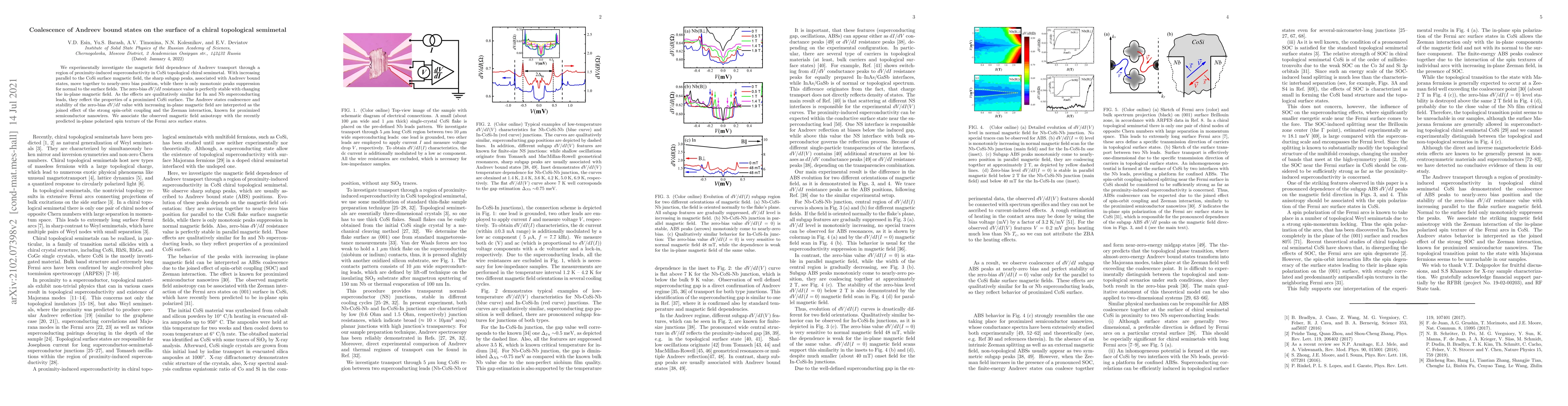 We experimentally investigate the magnetic field dependence of Andreev transport through a region of proximity-induced superconductivity in CoSi topological chiral semimetal. With increasing parallel to the CoSi surface magnetic field, the sharp subgap peaks, associated with Andreev bound states, move together to nearly-zero bias position, while there is only monotonous peaks suppression for normal to the surface fields. The zero-bias $dV/dI$ resistance value is perfectly stable with changing the in-plane magnetic field. As the effects are qualitatively similar for In and Nb superconducting leads, they reflect the properties of proximized CoSi surface. The Andreev states coalescence and stability of the zero-bias $dV/dI$ value with increasing in-plane magnetic field are interpreted as the joined effect of the strong SOC and the Zeeman interaction, known for proximized semiconductor nanowires. We associate the observed magnetic field anisotropy with the recently predicted in-plane polarized spin texture of the Fermi arcs surface states.