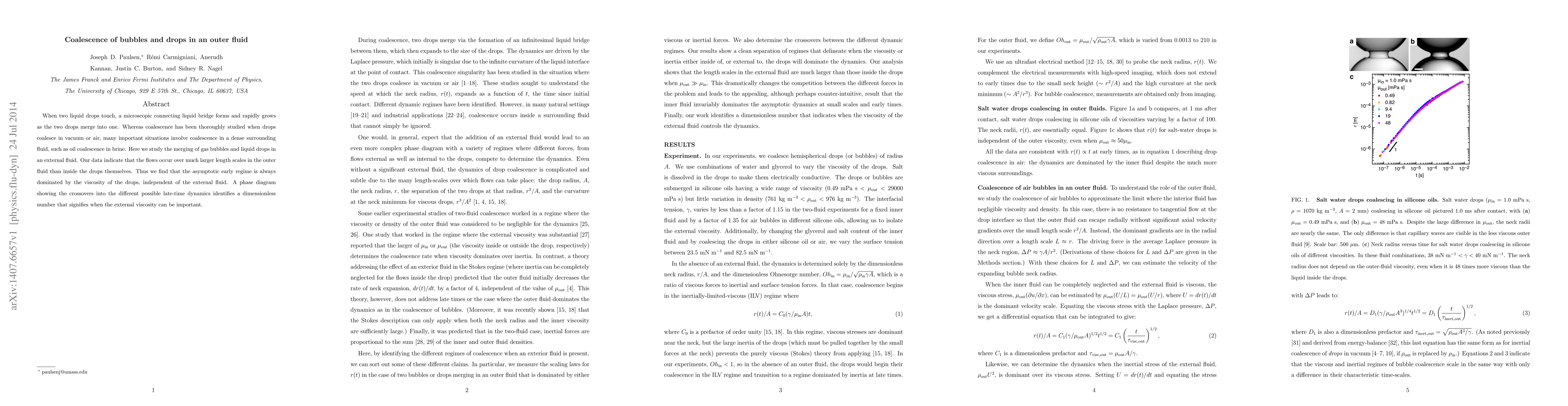 This paper explores the coalescence of gas bubbles and liquid drops in an external fluid, revealing that the merging process is dominated by the viscosity of the drops rather than the external fluid. A phase diagram identifies a dimensionless number indicating when the external fluid's viscosity becomes significant.