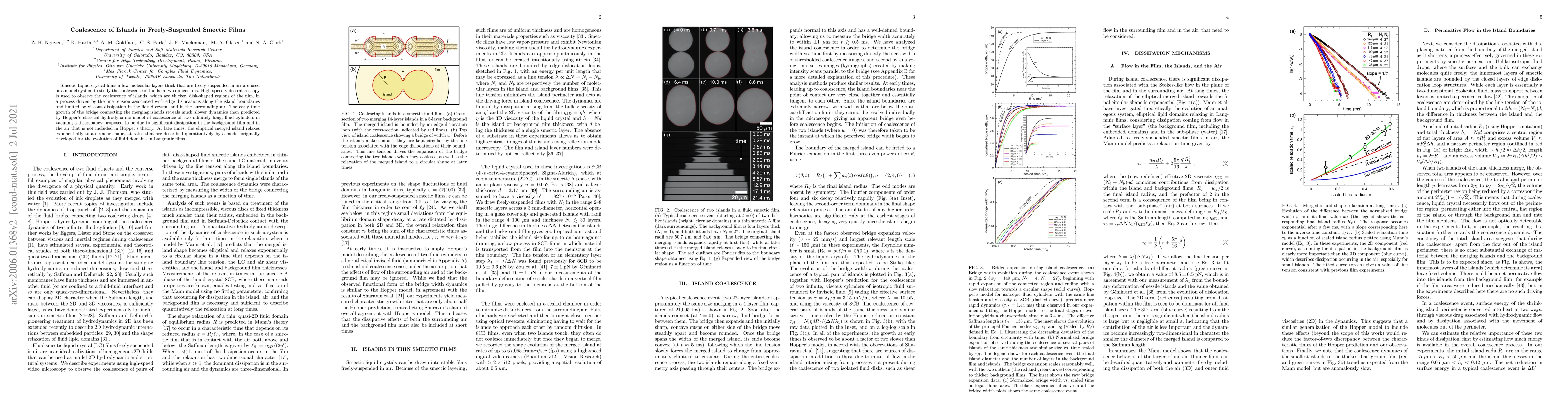 This study uses high-speed microscopy to investigate the coalescence of islands in freely-suspended smectic liquid crystal films, driven by edge dislocations and constrained by viscous dissipation. Contrary to Hopper's model, the bridge growth rate is slower due to significant dissipation, while the merged island's shape relaxation is quantitatively explained by a model for Langmuir film domain evolution.