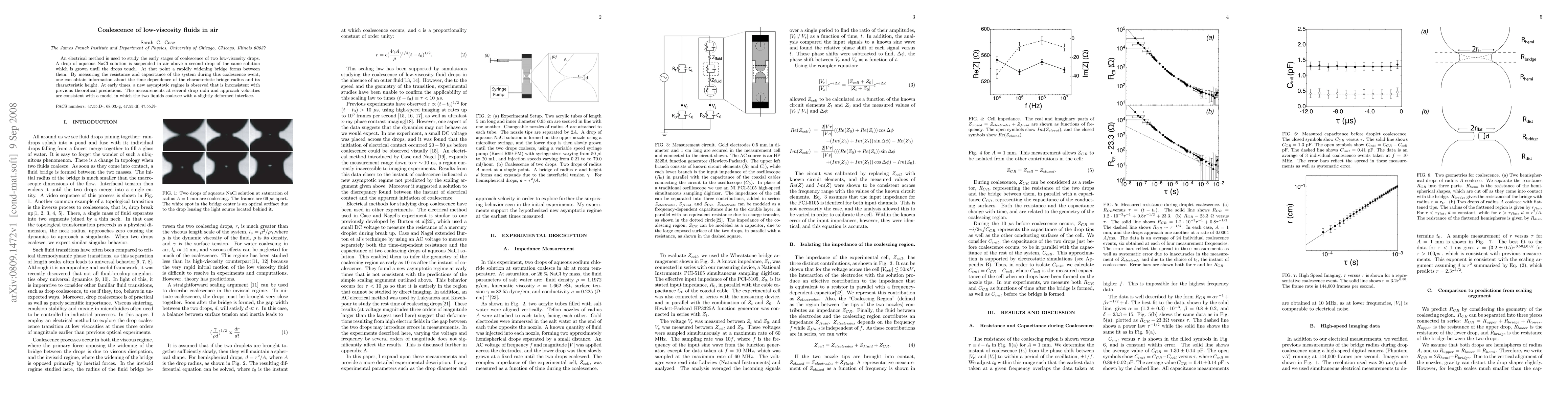 An electrical method is used to study the early stages of coalescence of two low-viscosity drops. A drop of aqueous NaCl solution is suspended in air above a second drop of the same solution which is grown until the drops touch. At that point a rapidly widening bridge forms between them. By measuring the resistance and capacitance of the system during this coalescence event, one can obtain information about the time dependence of the characteristic bridge radius and its characteristic height. At early times, a new asymptotic regime is observed that is inconsistent with previous theoretical predictions. The measurements at several drop radii and approach velocities are consistent with a model in which the two liquids coalesce with a slightly deformed interface.