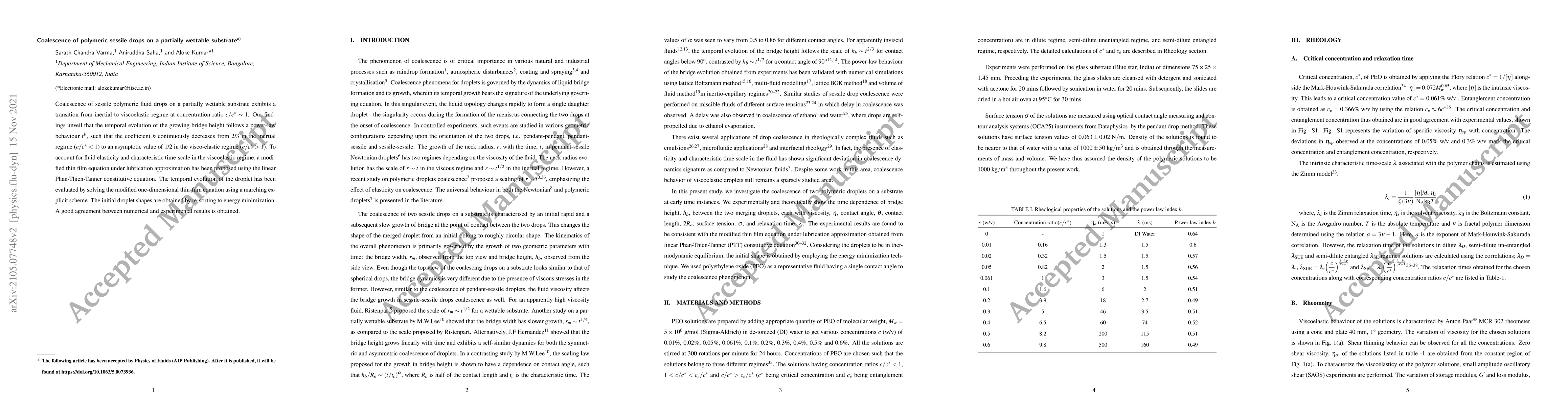 Coalescence of sessile polymeric fluid drops on a partially wettable substrate exhibits a transition from inertial to viscoelastic regime at concentration ratio $c/c^* \sim 1$. Our findings unveil that the temporal evolution of the growing bridge height follows a power-law behaviour $t^b$, such that the coefficient $b$ continuously decreases from 2/3 in the inertial regime ($c/c^*<1$) to an asymptotic value of 1/2 in the visco-elastic regime ($c/c^*>1$). To account for fluid elasticity and characteristic time-scale in the viscoelastic regime, a modified thin film equation under lubrication approximation has been proposed using the linear Phan-Thien- Tanner constitutive equation. The temporal evolution of the droplet has been evaluated by solving the modified one-dimensional thin-film equation using a marching explicit scheme. The initial droplet shapes are obtained by re-sorting to energy minimization. A good agreement between numerical and experimental results is obtained.