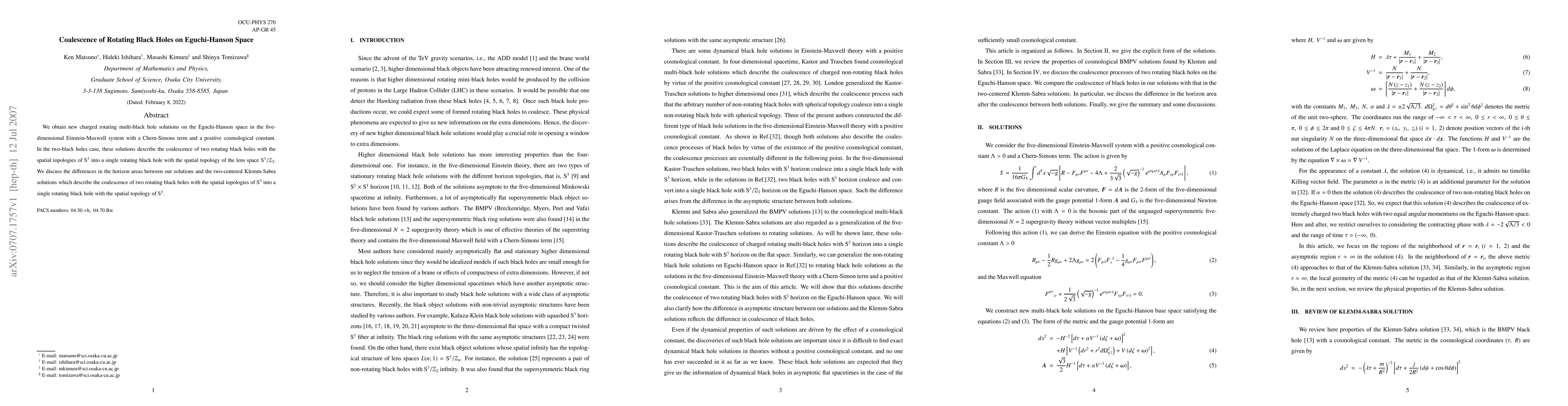 This paper presents new charged rotating multi-black hole solutions in five-dimensional Einstein-Maxwell theory with a Chern-Simons term, focusing on the coalescence of two rotating black holes on Eguchi-Hanson space. The study highlights differences in horizon areas between the proposed solutions and the Klemm-Sabra solutions.