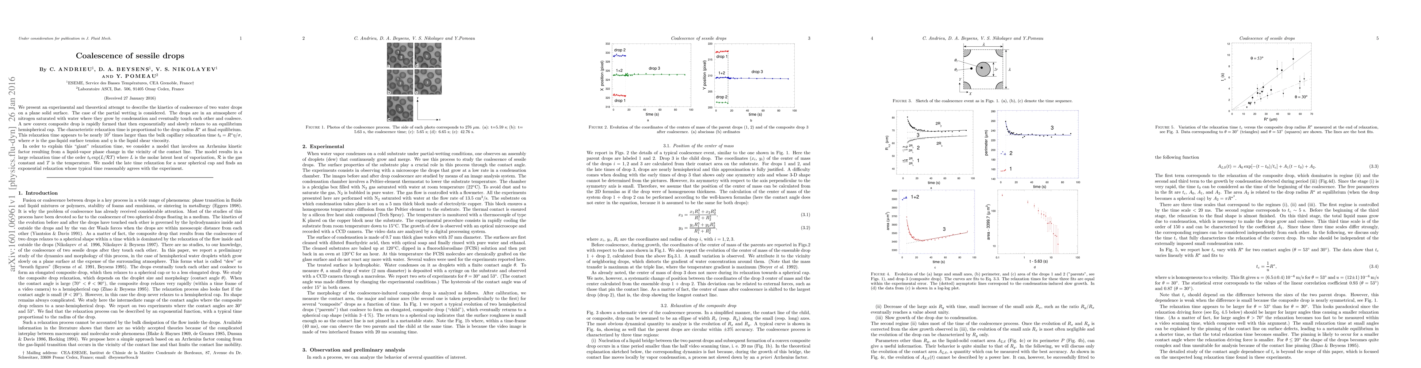 We present an experimental and theoretical description of the kinetics of coalescence of two water drops on a plane solid surface. The case of partial wetting is considered. The drops are in an atmosphere of nitrogen saturated with water where they grow by condensation and eventually touch each other and coalesce. A new convex composite drop is rapidly formed that then exponentially and slowly relaxes to an equilibrium hemispherical cap. The characteristic relaxation time is proportional to the drop radius R * at final equilibrium. This relaxation time appears to be nearly 10 7 times larger than the bulk capillary relaxation time t b = R * $\eta$/$\sigma$, where $\sigma$ is the gas--liquid surface tension and $\eta$ is the liquid shear viscosity. In order to explain this extremely large relaxation time, we consider a model that involves an Arrhenius kinetic factor resulting from a liquid--vapour phase change in the vicinity of the contact line. The model results in a large relaxation time of order t b exp(L/RT) where L is the molar latent heat of vaporization, R is the gas constant and T is the temperature. We model the late time relaxation for a near spherical cap and find an exponential relaxation whose typical time scale agrees reasonably well with the experiment. 1. Introduction Fusion or coalescence between drops is a key process in a wide range of phenomena: phase transition in fluids and liquid mixtures or polymers, stability of foams and emulsions, and sintering in metallurgy (Eggers 1998), which is why the problem of coalescence has already received considerable attention. Most of the studies of this process so far have been devoted to the coalescence of two spherical drops floating in a medium. The kinetics of the process before and after the drops have touched each other is governed by the hydrodynamics inside and outside the drops and by the van der Waals forces when the drops are within mesoscopic distance from each other (Yiantsios \& Davis 1991). The composite drop that results from the coalescence of two drops relaxes to a spherical shape within a time which is dominated by the relaxation of the flow inside and outside (Nikolayev, Beysens \& Guenoun 1996; Nikolayev \& Beysens 1997). There are no studies, to our knowledge, of the coalescence of two sessile drops after they touch each other. In this paper, we report a preliminary study of the dynamics and morphology of this process, in the case of hemispherical water droplets which grow slowly on a plane surface at the expense of the surrounding atmosphere, forming what is called 'dew' or 'breath figures' (Beysens et al. 1991; Beysens 1995). The drops eventually touch each other and coalesce to form an elongated composite