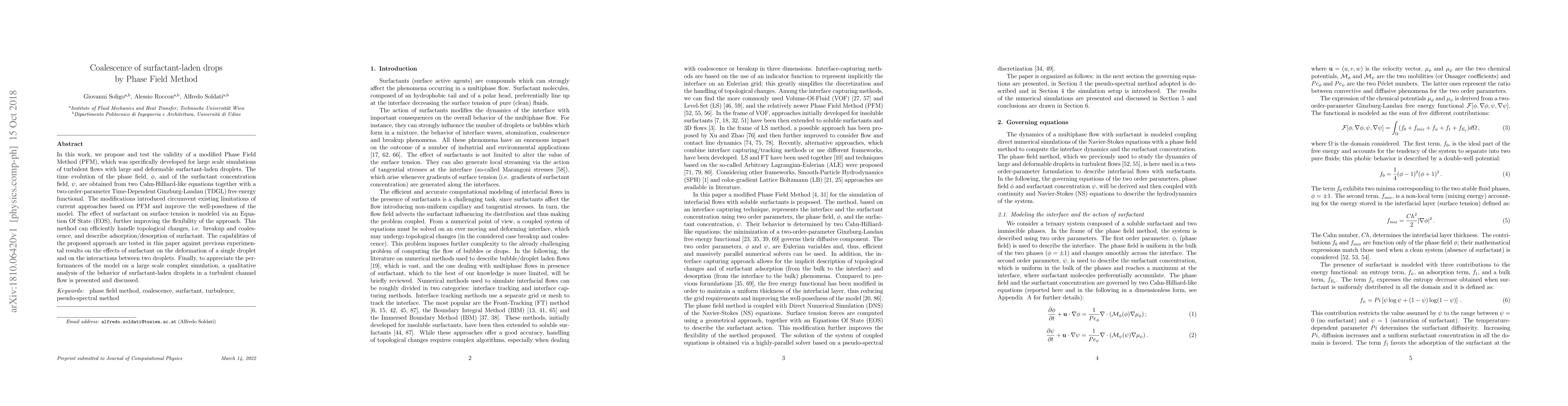 In this work, we propose and test the validity of a modified Phase Field Method (PFM), which was specifically developed for large scale simulations of turbulent flows with large and deformable surfactant-laden droplets. The time evolution of the phase field, {\phi}, and of the surfactant concentration field, {\psi}, are obtained from two Cahn-Hilliard-like equations together with a two-order-parameter Time-Dependent Ginzburg-Landau (TDGL) free energy functional. The modifications introduced circumvent existing limitations of current approaches based on PFM and improve the well-posedness of the model. The effect of surfactant on surface tension is modeled via an Equation Of State (EOS), further improving the flexibility of the approach. This method can efficiently handle topological changes, i.e. breakup and coalescence, and describe adsorption/desorption of surfactant. The capabilities of the proposed approach are tested in this paper against previous experimental results on the effects of surfactant on the deformation of a single droplet and on the interactions between two droplets. Finally, to appreciate the performances of the model on a large scale complex simulation, a qualitative analysis of the behavior of surfactant-laden droplets in a turbulent channel flow is presented and discussed.