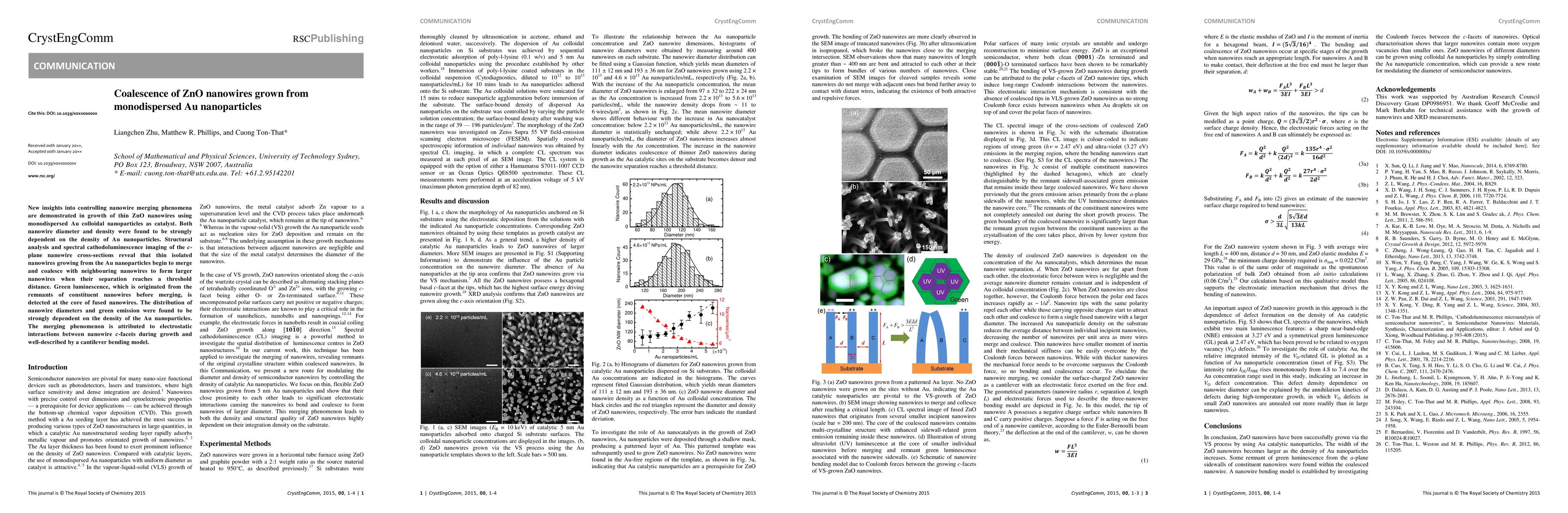 This study explores the coalescence of ZnO nanowires grown from monodispersed Au nanoparticles, revealing that nanowire merging is influenced by the density of Au catalysts and is driven by electrostatic interactions. The research highlights the dependence of nanowire diameter and green luminescence on Au nanoparticle density, and attributes the merging to a cantilever bending model.