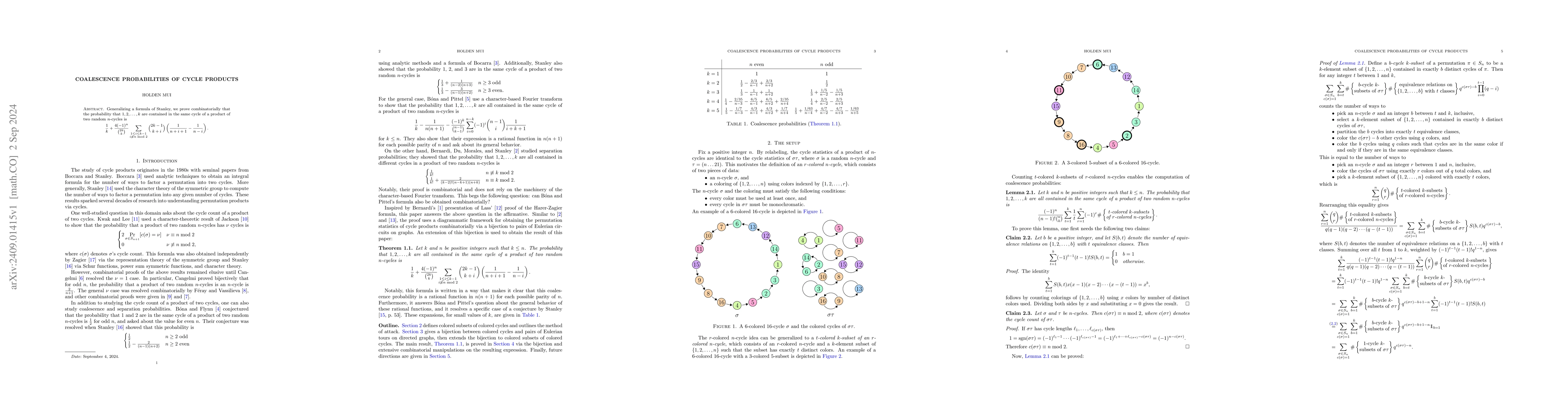 This paper generalizes a formula of Stanley to prove a combinatorial expression for the probability that specific integers appear together in the same cycle when two random $n$-cycles are multiplied, providing a detailed mathematical formula for this coalescence probability.
