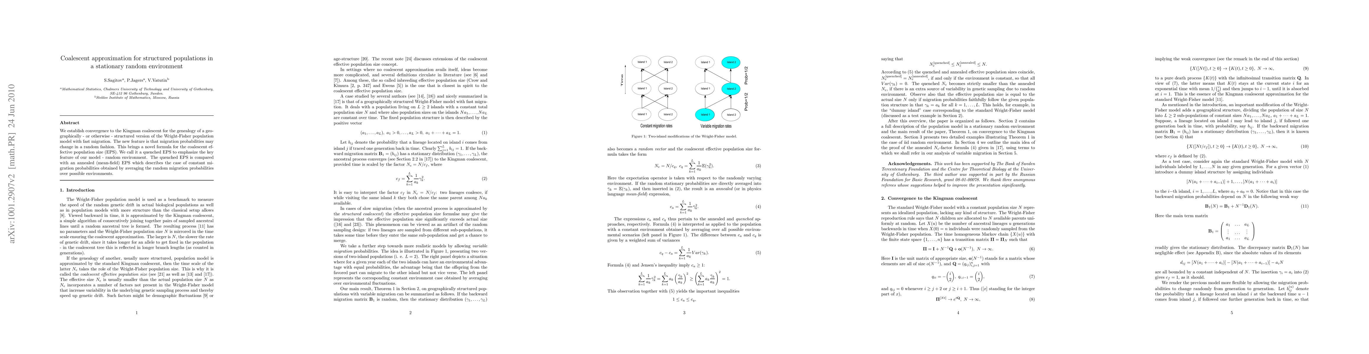 This paper establishes the convergence to the Kingman coalescent for a structured Wright-Fisher model with variable migration probabilities in a random environment, introducing a novel "quenched EPS" formula. It contrasts this with an "annealed EPS" for constant migration probabilities, highlighting the impact of environmental variability.