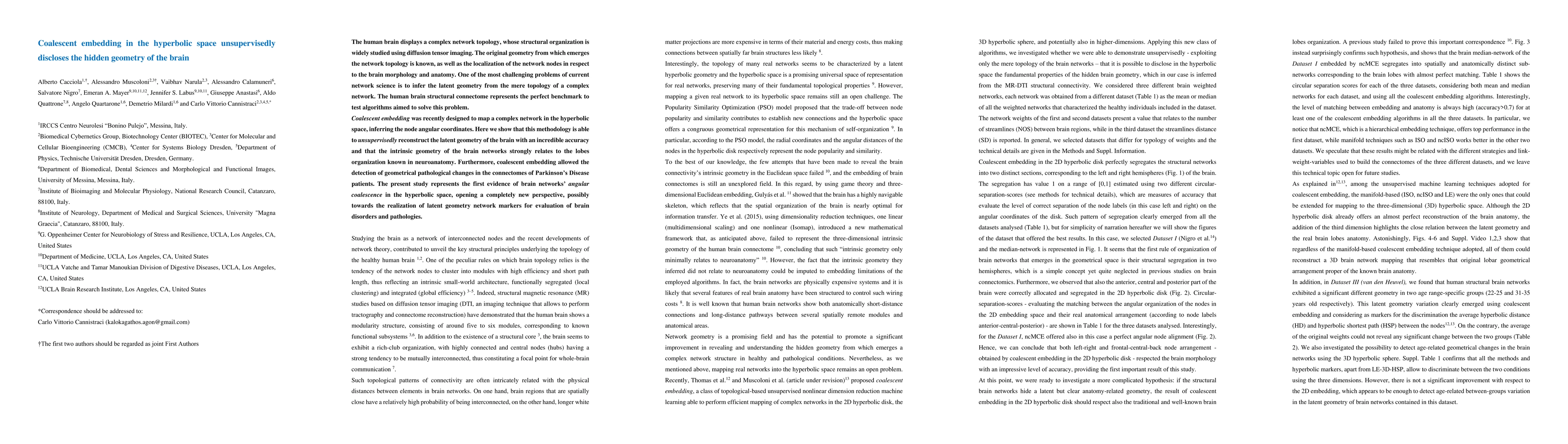 The human brain displays a complex network topology, whose structural organization is widely studied using diffusion tensor imaging. The original geometry from which emerges the network topology is known, as well as the localization of the network nodes in respect to the brain morphology and anatomy. One of the most challenging problems of current network science is to infer the latent geometry from the mere topology of a complex network. The human brain structural connectome represents the perfect benchmark to test algorithms aimed to solve this problem. Coalescent embedding was recently designed to map a complex network in the hyperbolic space, inferring the node angular coordinates. Here we show that this methodology is able to unsupervisedly reconstruct the latent geometry of the brain with an incredible accuracy and that the intrinsic geometry of the brain networks strongly relates to the lobes organization known in neuroanatomy. Furthermore, coalescent embedding allowed the detection of geometrical pathological changes in the connectomes of Parkinson's Disease patients. The present study represents the first evidence of brain networks' angular coalescence in the hyperbolic space, opening a completely new perspective, possibly towards the realization of latent geometry network markers for evaluation of brain disorders and pathologies.
