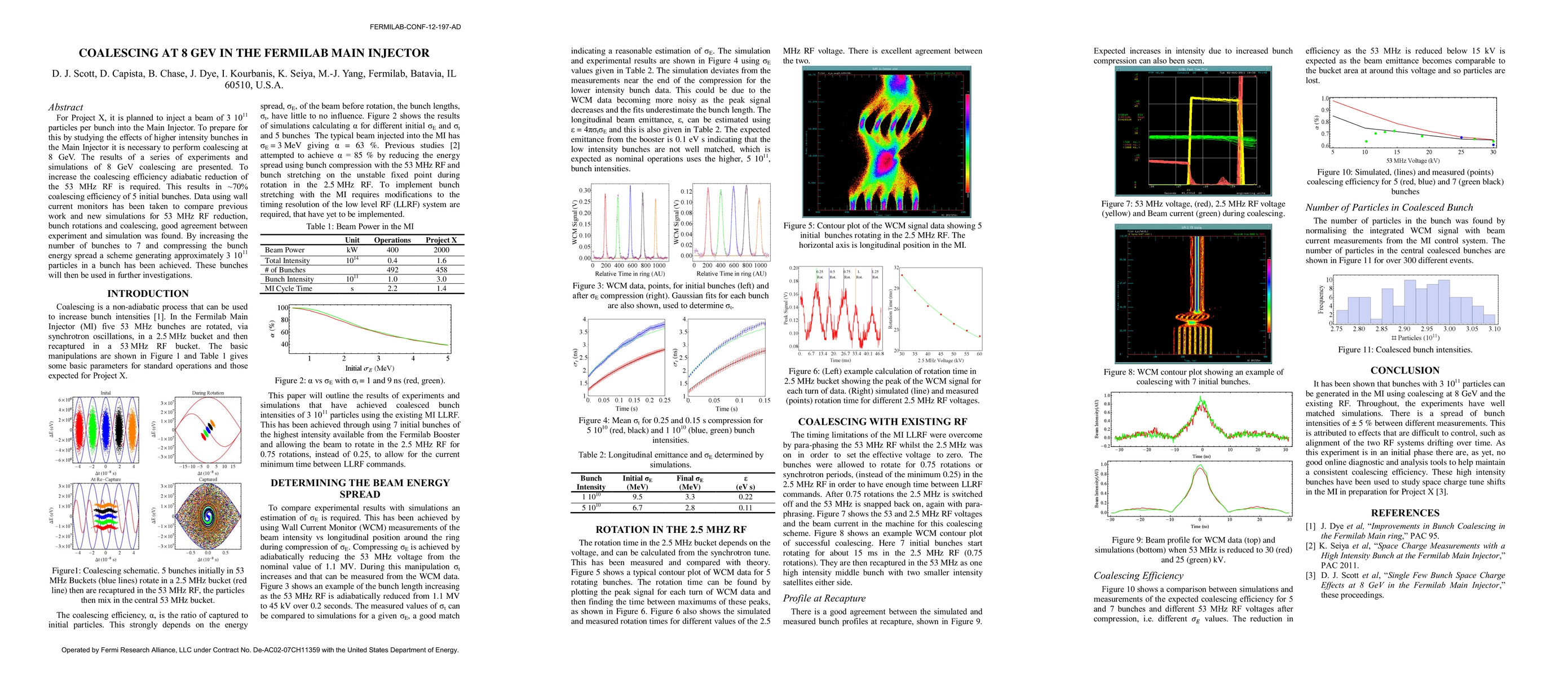 For Project X, it is planned to inject a beam of 3 10**11 particles per bunch into the Main Injector. To prepare for this by studying the effects of higher intensity bunches in the Main Injector it is necessary to perform coalescing at 8 GeV. The results of a series of experiments and simulations of 8 GeV coalescing are presented. To increase the coalescing efficiency adiabatic reduction of the 53 MHz RF is required, resulting in ~70% coalescing efficiency of 5 initial bunches. Data using wall current monitors has been taken to compare previous work and new simulations for 53 MHz RF reduction, bunch rotations and coalescing, good agreement between experiment and simulation was found. Possible schemes to increase the coalescing efficiency and generate even higher intensity bunches are discussed. These require improving the timing resolution of the low level RF and/or tuning the adiabatic voltage reduction of the 53 MHz.