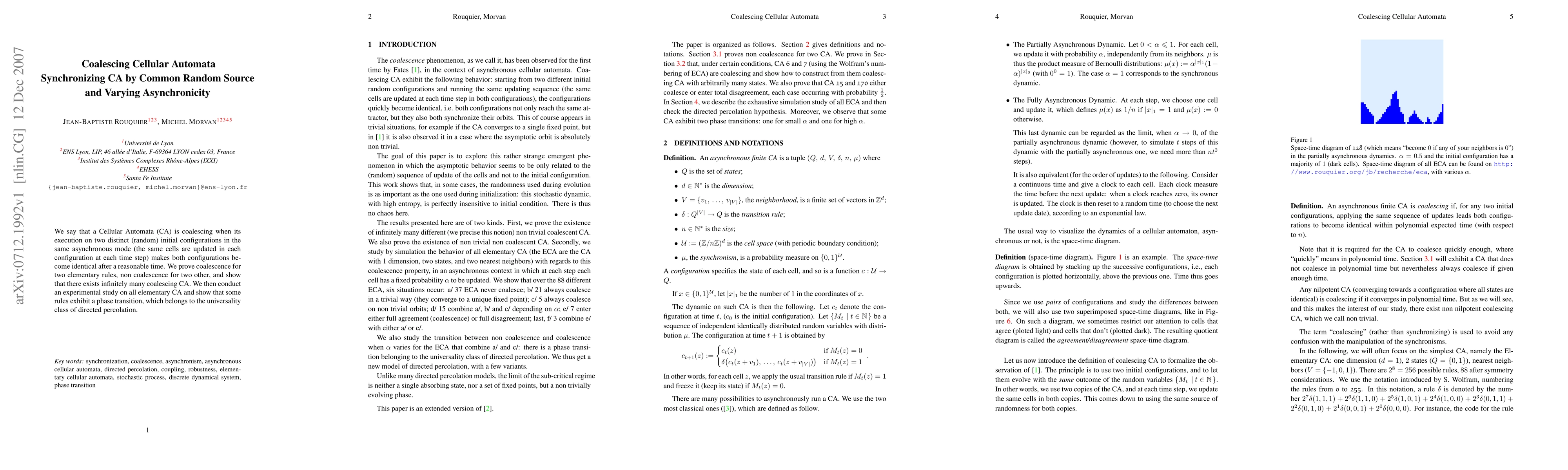 We say that a Cellular Automata (CA) is coalescing when its execution on two distinct (random) initial configurations in the same asynchronous mode (the same cells are updated in each configuration at each time step) makes both configurations become identical after a reasonable time. We prove coalescence for two elementary rules, non coalescence for two other, and show that there exists infinitely many coalescing CA. We then conduct an experimental study on all elementary CA and show that some rules exhibit a phase transition, which belongs to the universality class of directed percolation.