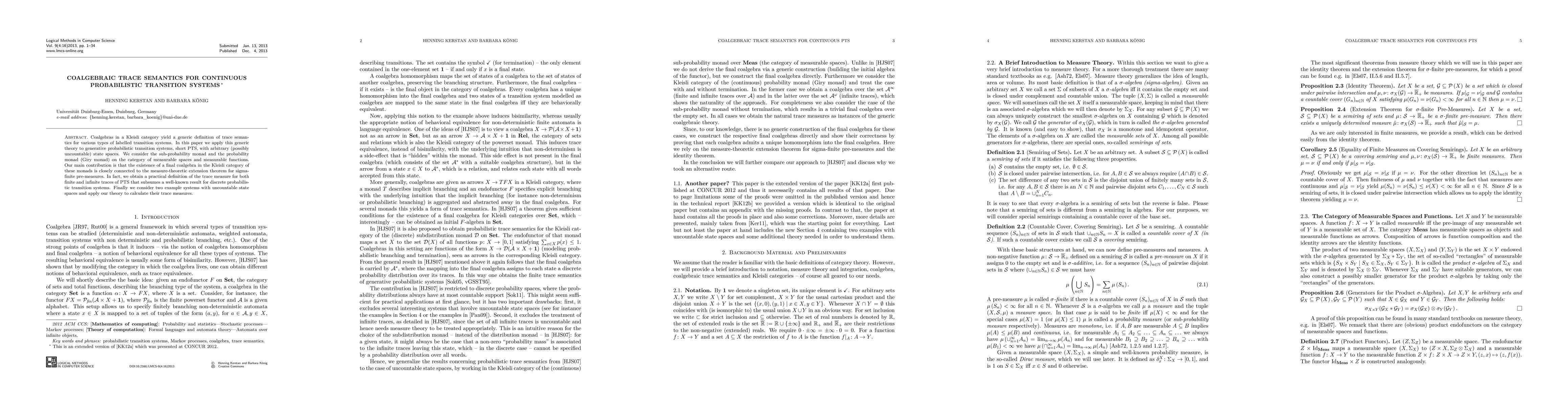 This paper applies coalgebraic trace semantics to continuous probabilistic transition systems (PTS) with uncountable state spaces, linking the existence of a final coalgebra in the Kleisli category of sub-probability and Giry monads to the measure-theoretic extension theorem. It provides a practical definition of trace measures that extends beyond discrete systems and demonstrates its application through examples.