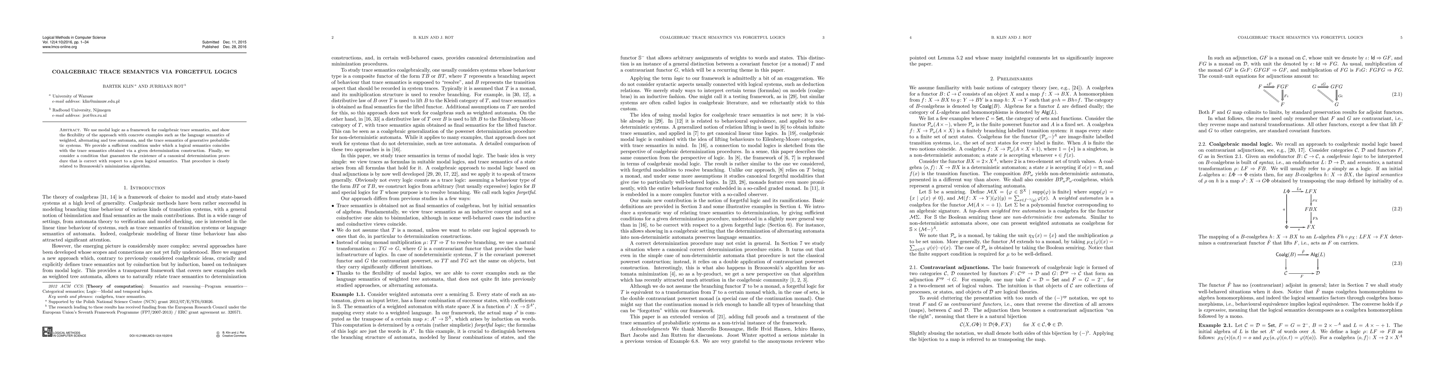This paper explores the application of modal logic for coalgebraic trace semantics, demonstrating its versatility through examples involving weighted, alternating, and tree automata, and generative probabilistic systems. It also establishes conditions for logical semantics alignment with trace semantics and introduces a canonical determinization procedure akin to Brzozowski's minimization algorithm.