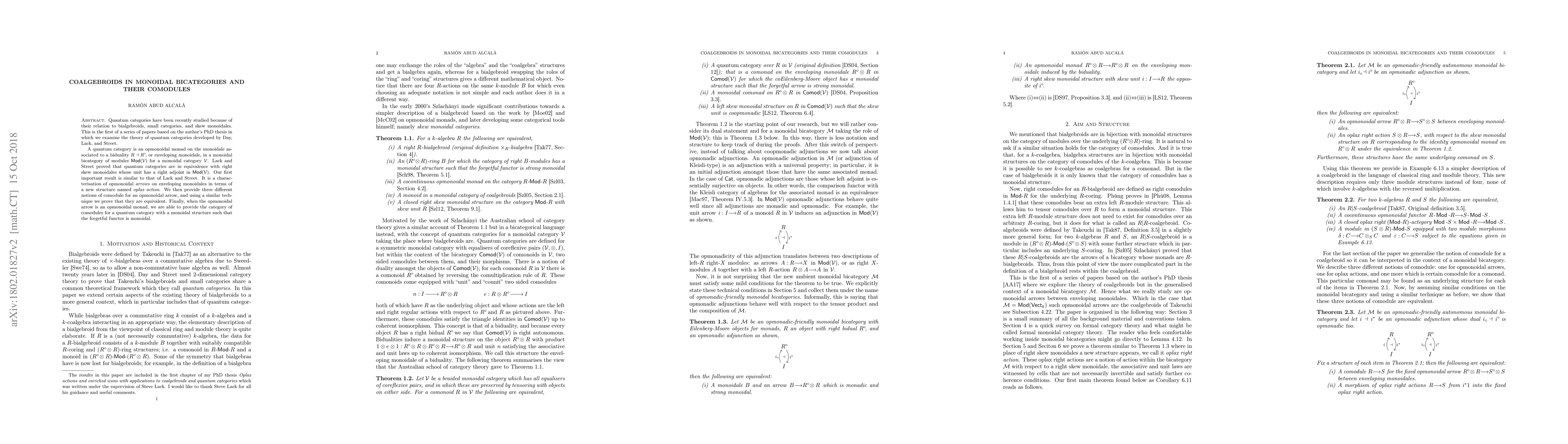 Quantum categories have been recently studied because of their relation to bialgebroids, small categories, and skew monoidales. This is the first of a series of papers based on the author's PhD thesis in which we examine the theory of quantum categories developed by Day, Lack, and Street. A quantum category is an opmonoidal monad on the monoidale associated to a biduality $R\dashv R^{\circ}$, or enveloping monoidale, in a monoidal bicategory of modules $\mathsf{Mod}(\mathcal{V})$ for a monoidal category $\mathcal{V}$. Lack and Street proved that quantum categories are in equivalence with right skew monoidales whose unit has a right adjoint in $\mathsf{Mod}(\mathcal{V})$. Our first important result is similar to that of Lack and Street. It is a characterisation of opmonoidal \emph{arrows} on enveloping monoidales in terms of a new structure named \emph{oplax action}. We then provide three different notions of comodule for an opmonoidal arrow, and using a similar technique we prove that they are equivalent. Finally, when the opmonoidal arrow is an opmonoidal monad, we are able to provide the category of comodules for a quantum category with a monoidal structure such that the forgetful functor is monoidal.