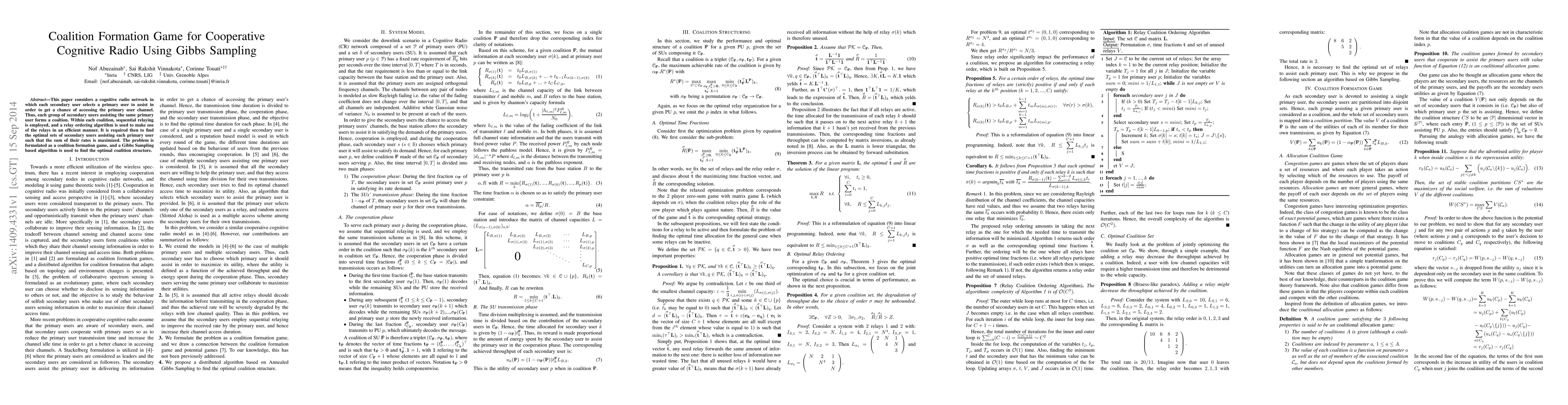 This paper explores a coalition formation game in cooperative cognitive radio networks where secondary users form coalitions to assist primary users, employing a Gibbs Sampling algorithm to optimize relay ordering and maximize the sum of data rates. The optimal coalition structure is determined through this approach.