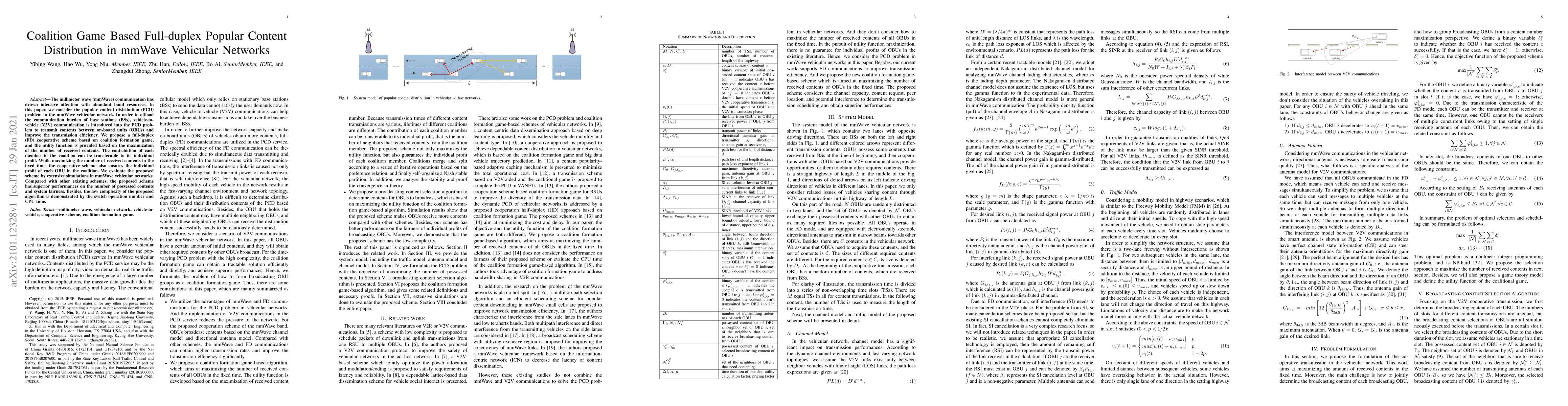 This paper proposes a full-duplex coalition game-based scheme for distributing popular content in mmWave vehicular networks, leveraging vehicle-to-vehicle communication to offload base stations. The scheme maximizes content reception while ensuring individual vehicle profits, demonstrating superior performance and low algorithmic complexity.
