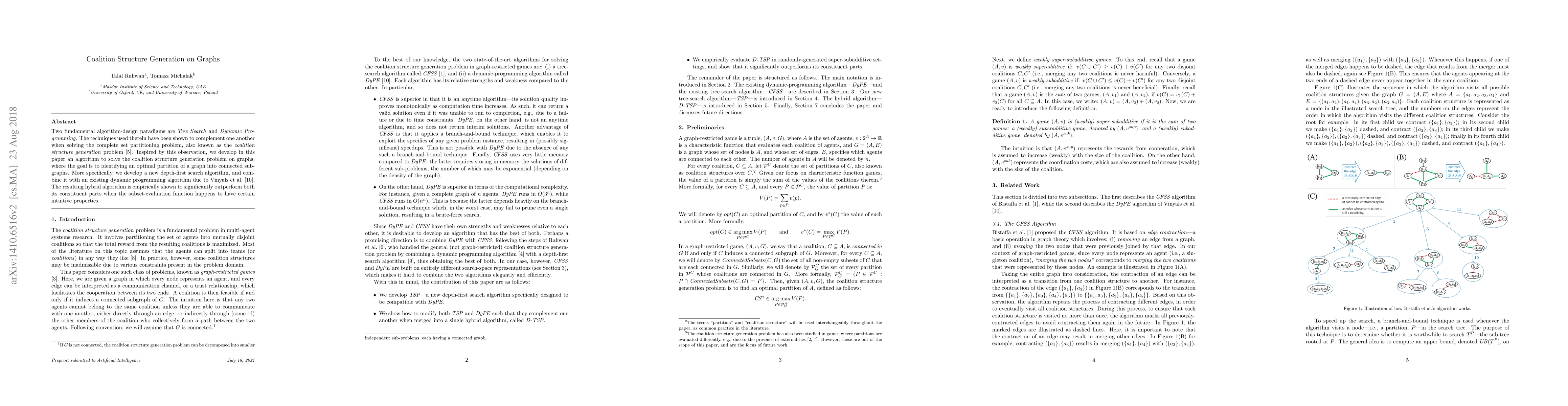 This paper presents a hybrid algorithm combining a new depth-first search method with an existing dynamic programming approach to solve the coalition structure generation problem on graphs, achieving superior performance when certain conditions on the subset-evaluation function are met.