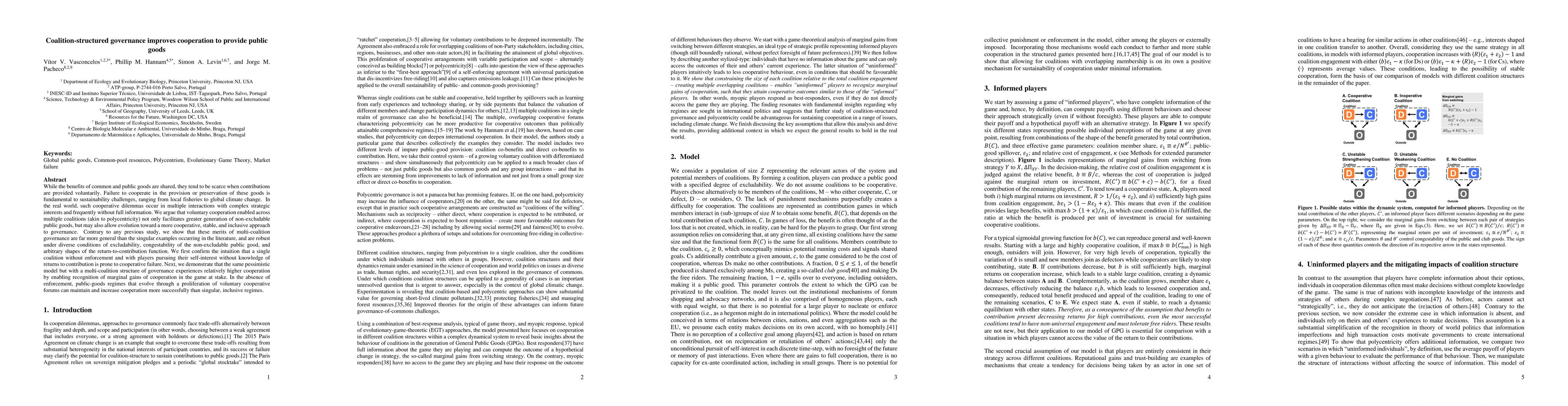 This paper argues that coalition-structured governance enhances voluntary cooperation to provide public goods, demonstrating that multi-coalition frameworks enable greater generation and sustainability of non-excludable public goods compared to single-coalition approaches. The study shows that multi-coalition governance fosters higher cooperation and stability, even under diverse conditions, highlighting its robustness and general applicability.