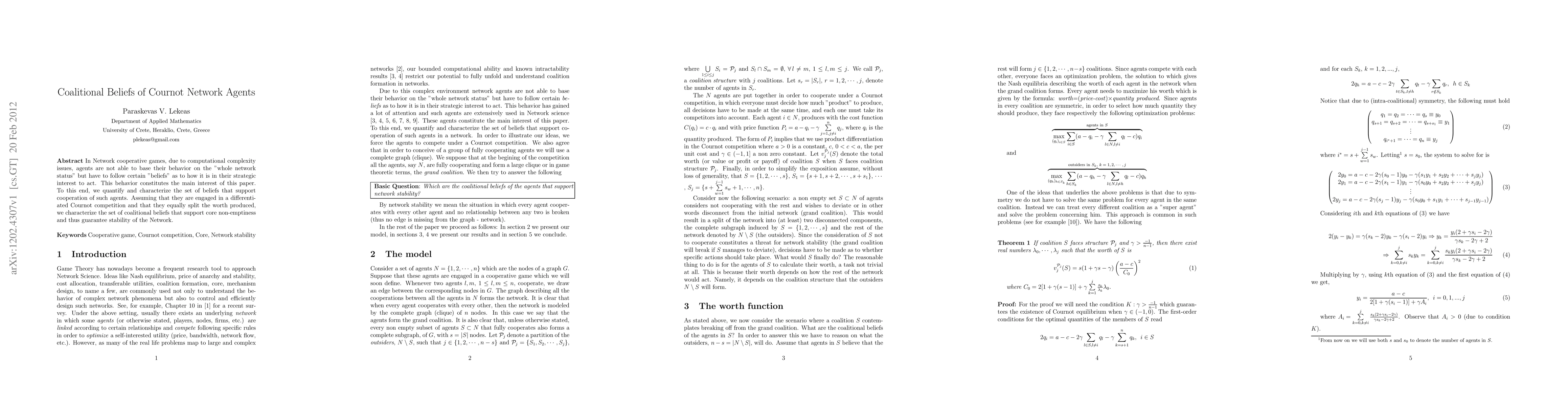 This paper investigates the coalitional beliefs that enable cooperative behavior among agents in a differentiated Cournot network competition. It characterizes the set of beliefs that ensure the core is non-empty, thereby guaranteeing the stability and sustainability of the network.