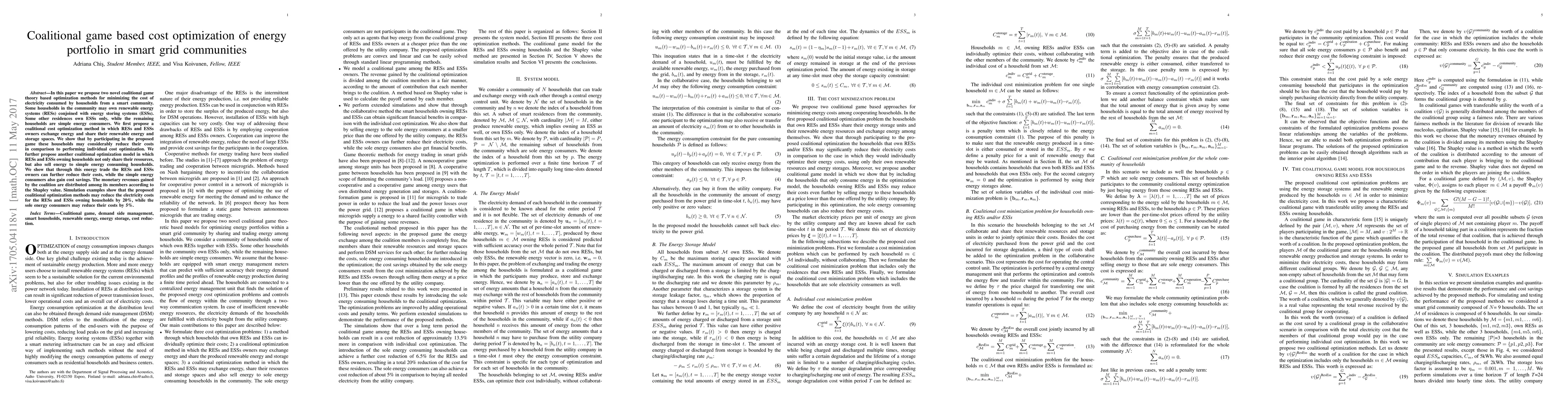 This paper proposes coalitional game theory-based optimization methods to minimize electricity costs in smart grid communities. The methods enable households with renewable energy systems and storage to share resources and sell energy, significantly reducing costs for all participants, with revenues distributed via the Shapley value.