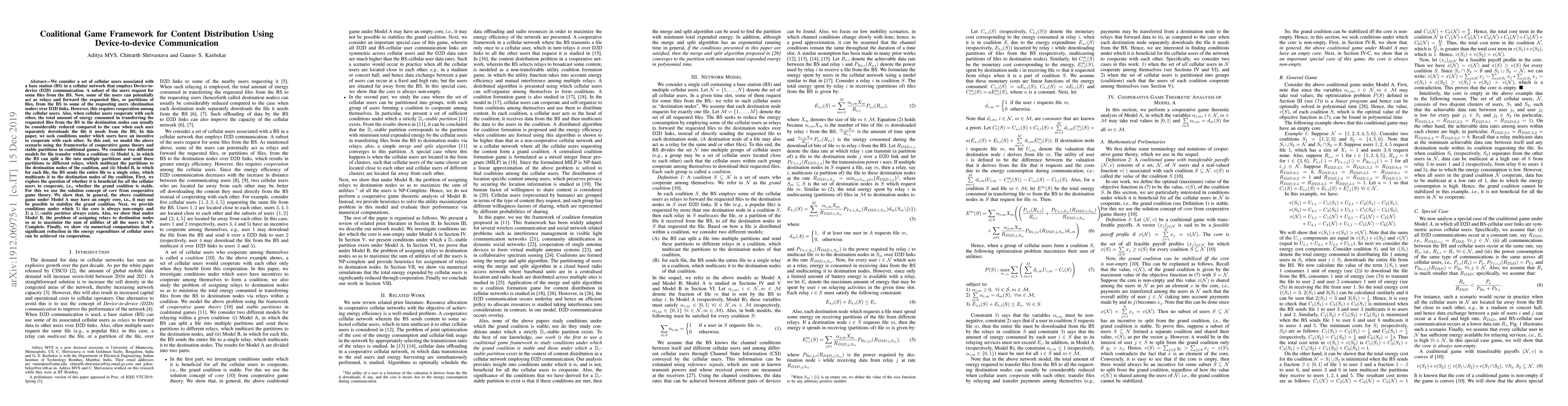 This paper explores a coalitional game framework for content distribution in cellular networks using Device-to-device (D2D) communication, focusing on conditions for user cooperation. It models two file transfer models and uses cooperative game theory to determine the stability of grand coalitions and the computational complexity of relay assignment, concluding that cooperation can significantly reduce energy expenditure.