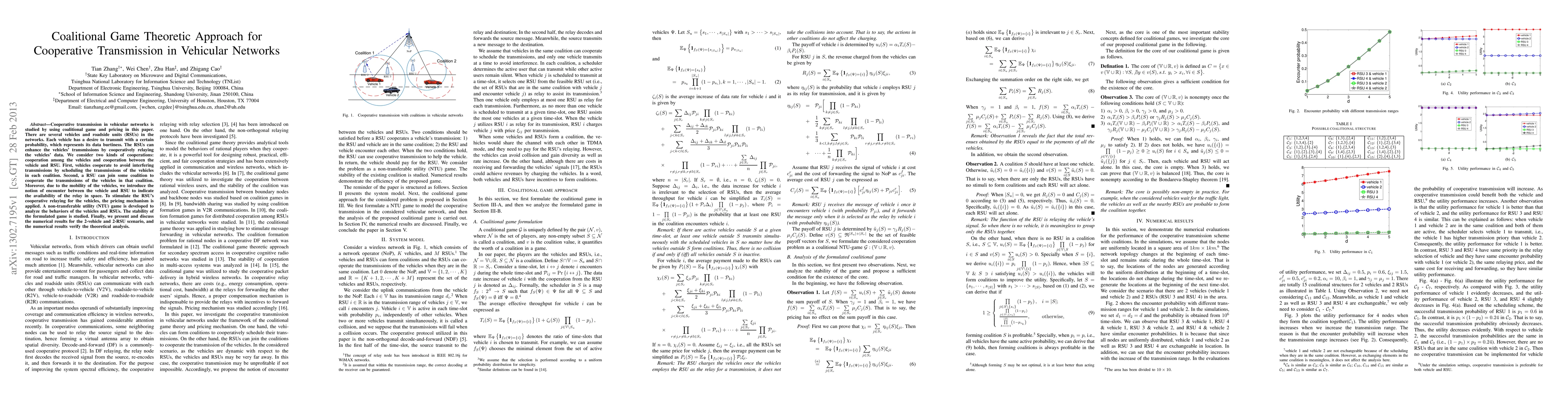 This paper employs a coalitional game theoretic approach to study cooperative transmission in vehicular networks, focusing on both vehicle-to-vehicle and vehicle-to-roadside unit cooperation, with a pricing mechanism to incentivize relaying. The stability of the developed non-transferable utility game is analyzed, and numerical results confirm the theoretical findings.