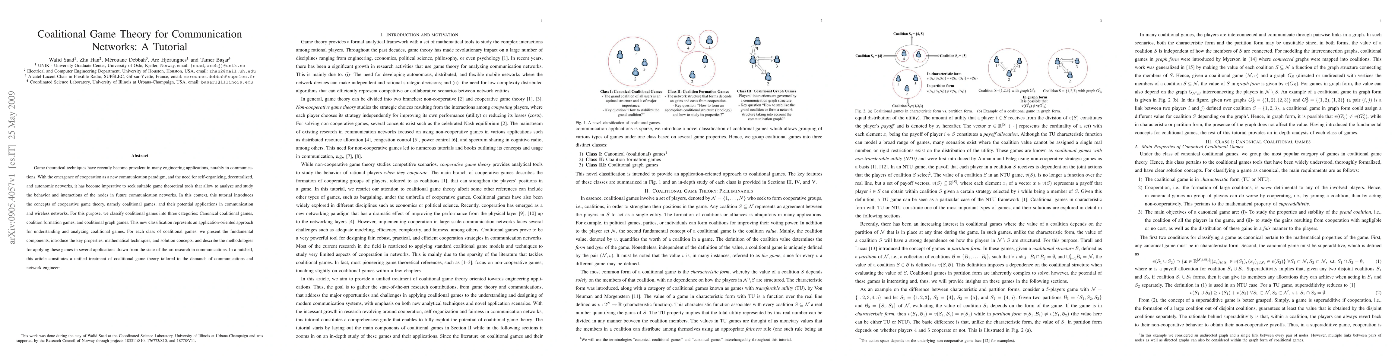 This tutorial introduces coalitional game theory for analyzing and understanding the behavior and interactions of nodes in communication networks, classifying coalitional games into canonical, formation, and graph games, and detailing their applications in modern communications.