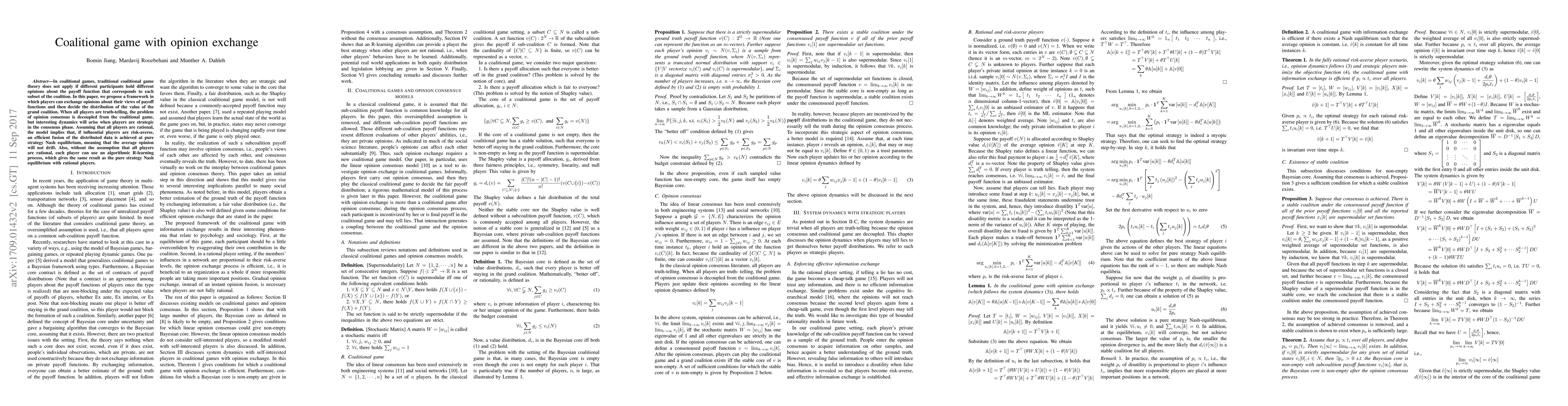 This paper introduces a coalitional game framework where players exchange opinions on payoff functions, leading to a consensus on the grand coalition's value. When all players are truthful, consensus dynamics are separate from the game, but strategic behavior complicates the process. The model shows that risk-averse influential players achieve efficient data fusion at a Nash equilibrium, and even non-rational players can use an R-learning algorithm to reach the same equilibrium outcome.